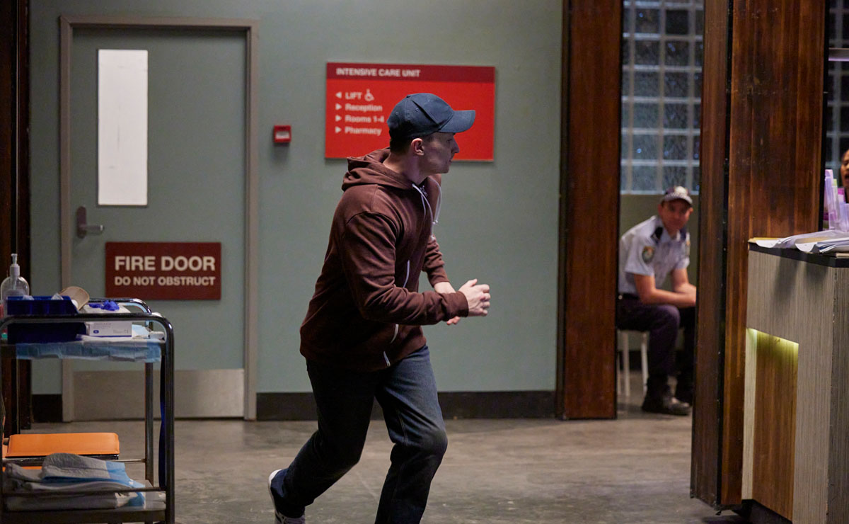 By the time Leah and Rose arrive, with a hospital security guard (Johnny Cordukes) in tow, Justin is in a heap on the floor whilst the police guard lies unconscious nearby. A breathless Justin explains that the guard’s return had interrupted Jordan, who had knocked him out before making his escape.