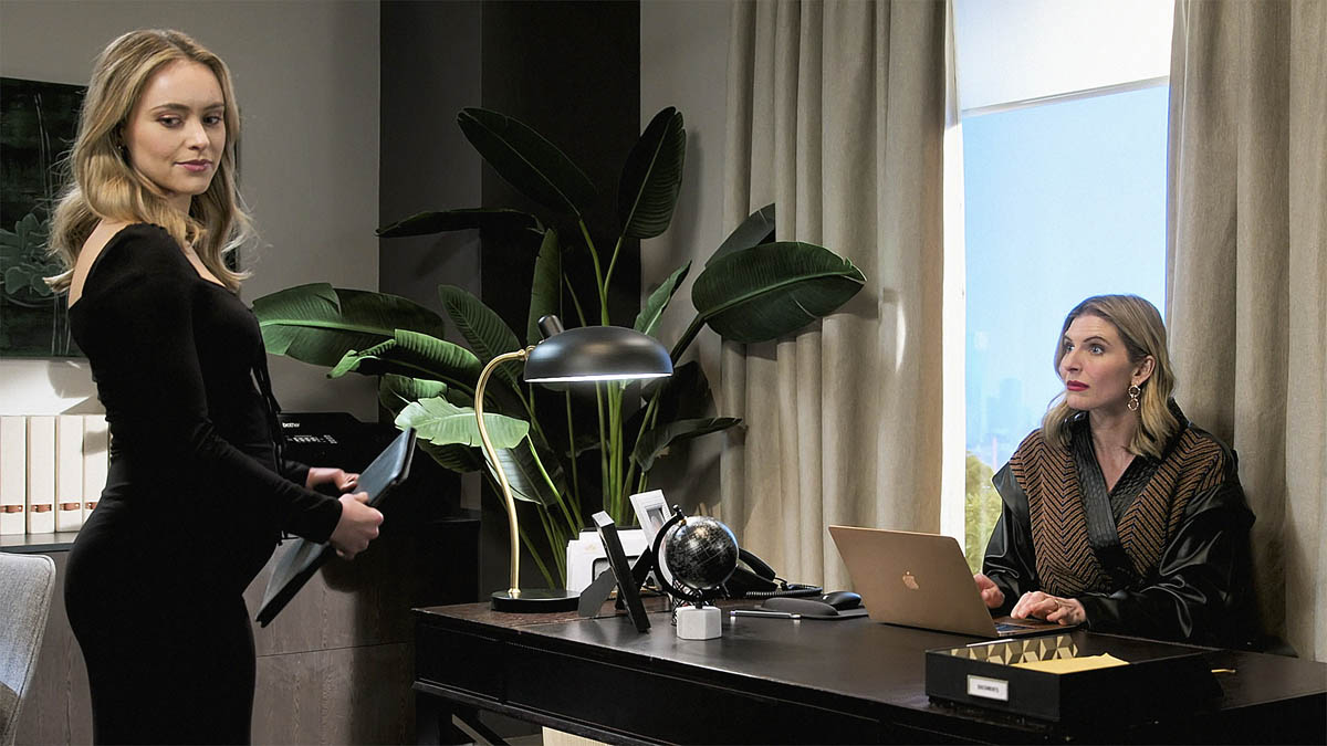 She makes a power play which will certainly turn a few heads. Pictures show her not only looking comfortable in Paul’s penthouse suite after being kicked out of No. 30, but sitting in his office chair, much to Krista’s (Majella Davis) bemusement.