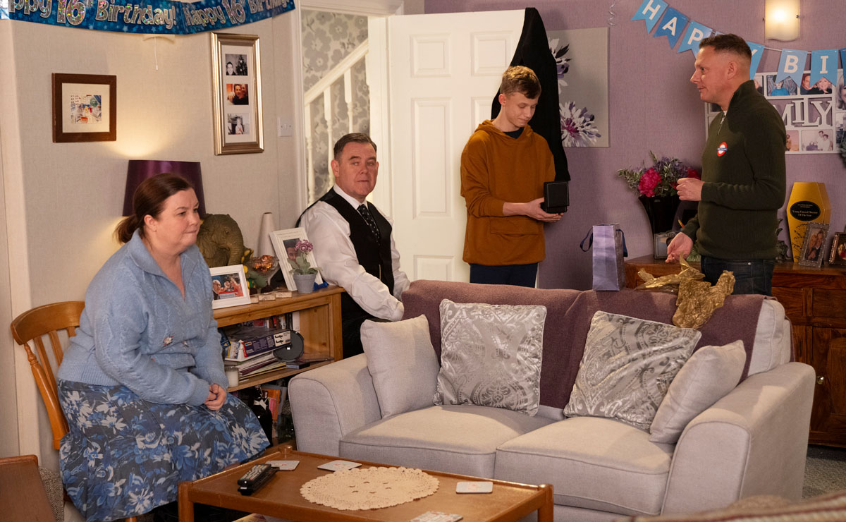 Later in the week, No.11 celebrates Dylan’s 16th birthday. Eileen (Sue Cleaver), Mary (Patti Clare) and George all do their best to make a fuss of Dylan, but Sean can barely look his son in the eye after his discovery.