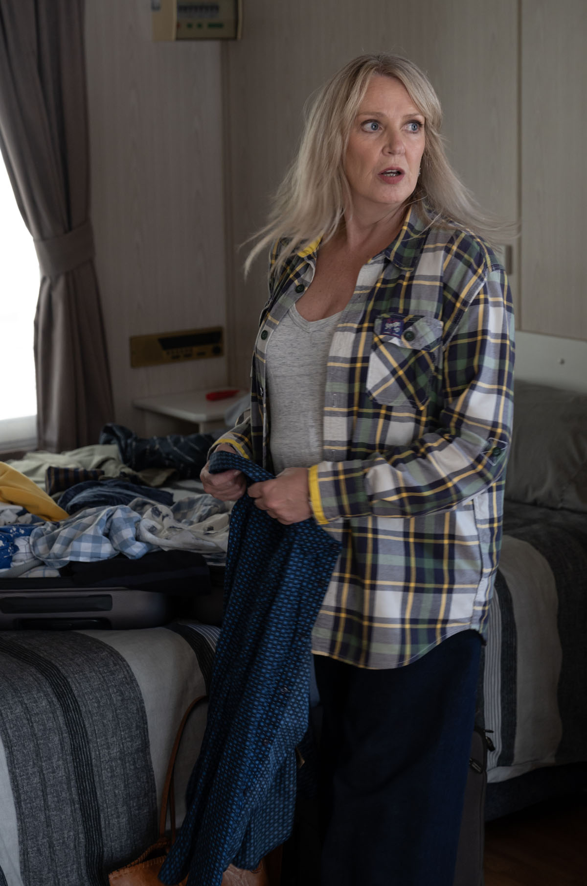 Next Tuesday 9th July, Melanie makes an impromptu appearance at Logan’s new caravan home, as Logan is busy trying on David’s old clothes.