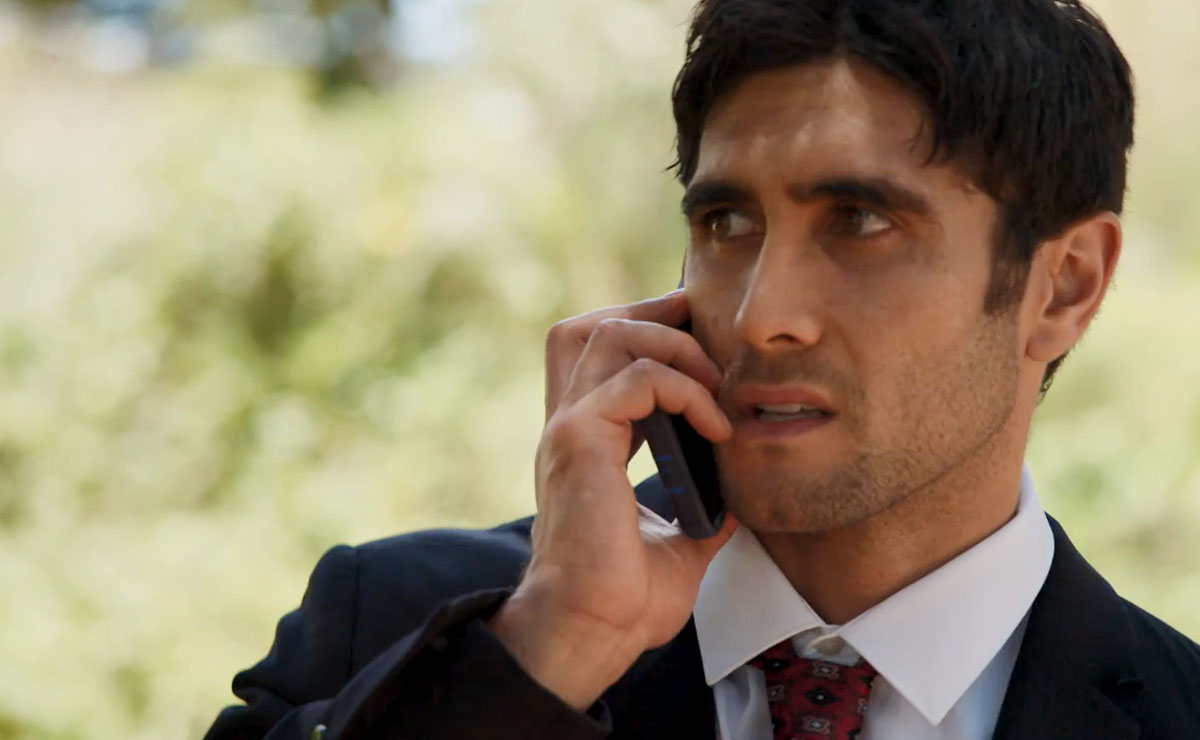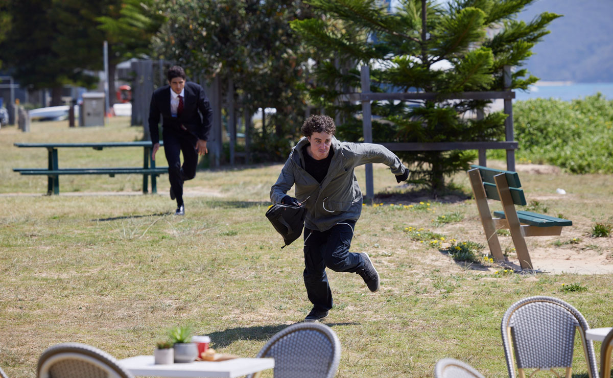 Flick rings Tane (Ethan Browne), who is out getting some fresh air before his court appearance, and warns him that a shooter is on the loose. Naturally, it’s Tane who then immediately spots a suspicious-looking Sidney walking briskly across the parkland with a large rifle bag.