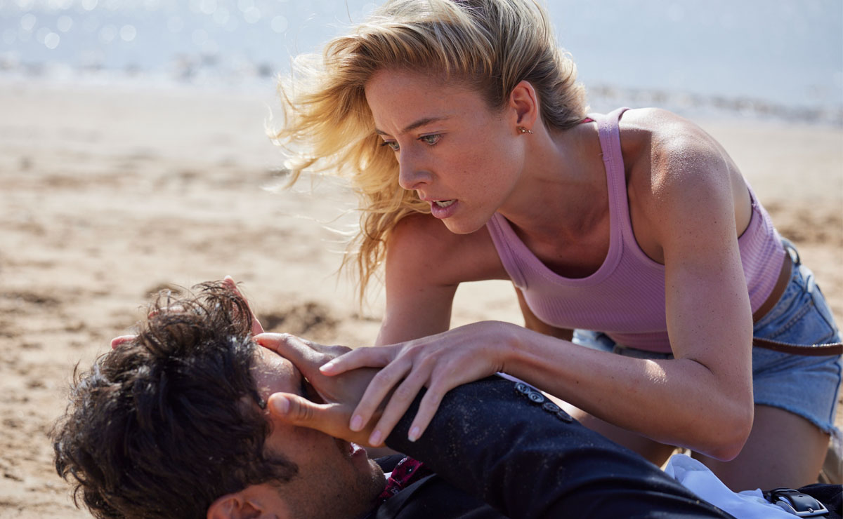 Tane chases Sidney onto Flat Beach before Sidney swiftly turns around and whacks Tane across the head with the rifle bag. The impact (inexplicably) sends Tane flying, and he crashes onto the sand holding his head.