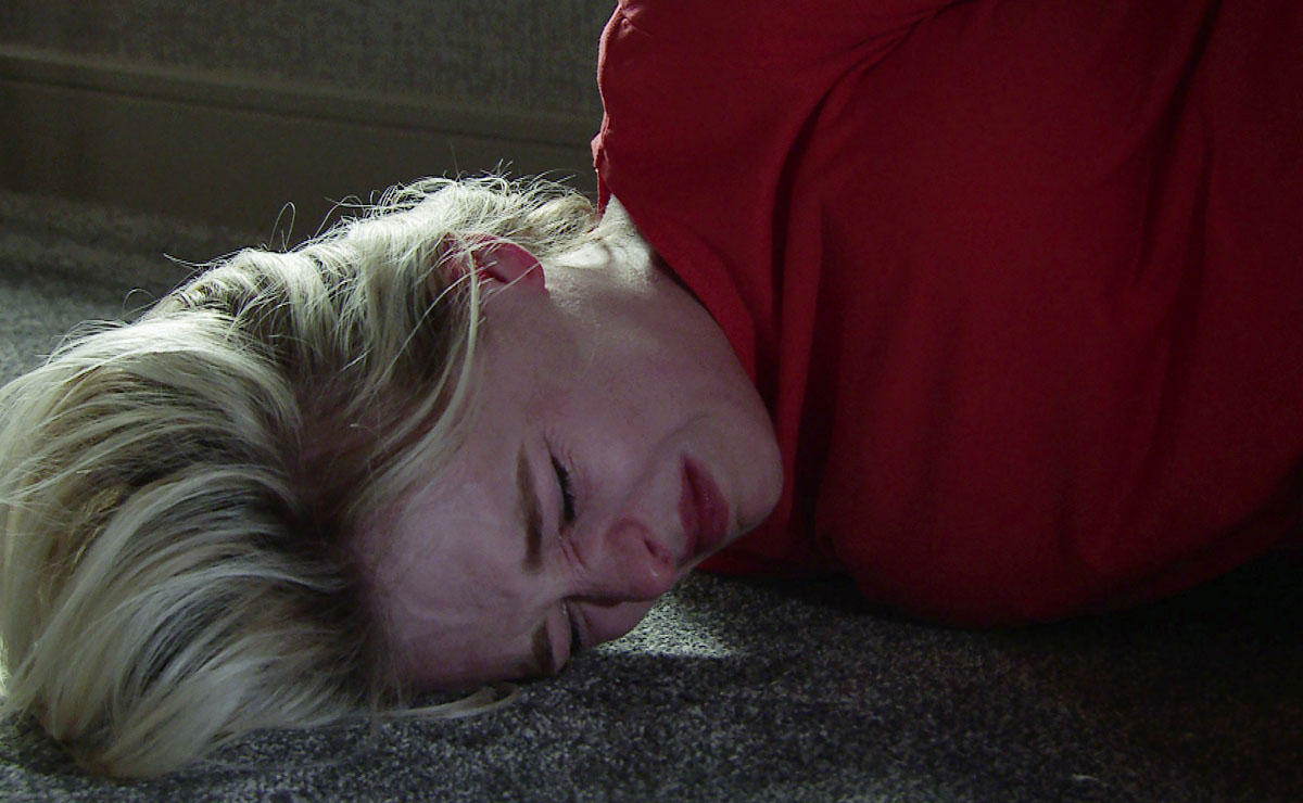 Later, Lauren is alone when she suddenly experiences severe stomach cramps. Doubling over in pain, she collapses on the floor as she cries out for help.