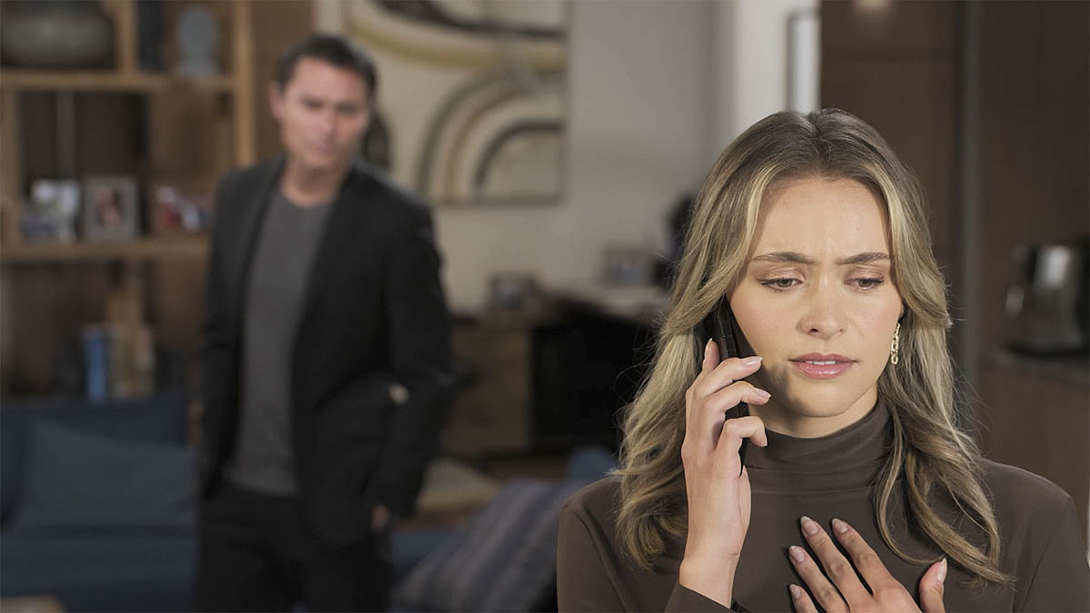 As earlier spoiler pictures revealed, the ex-husband and wife’s decision to snoop turns sinister when they’re caught by Heath and Tess’s burly henchman Justin (Richard Sutherland).