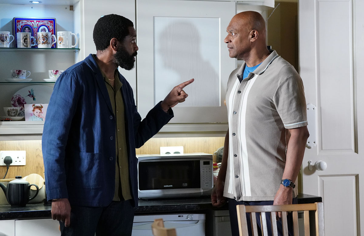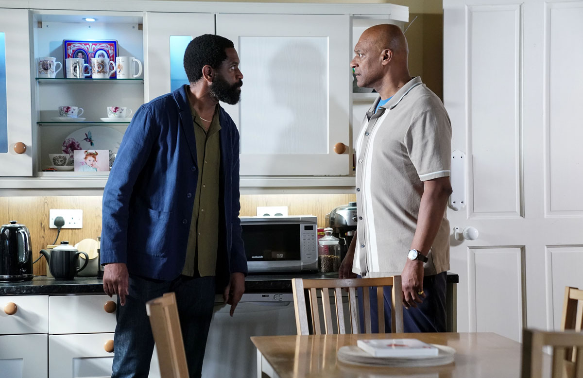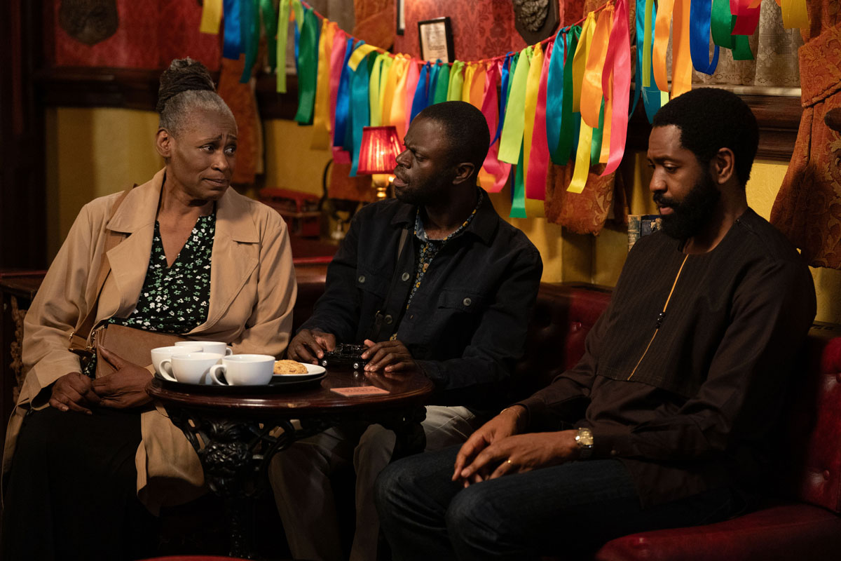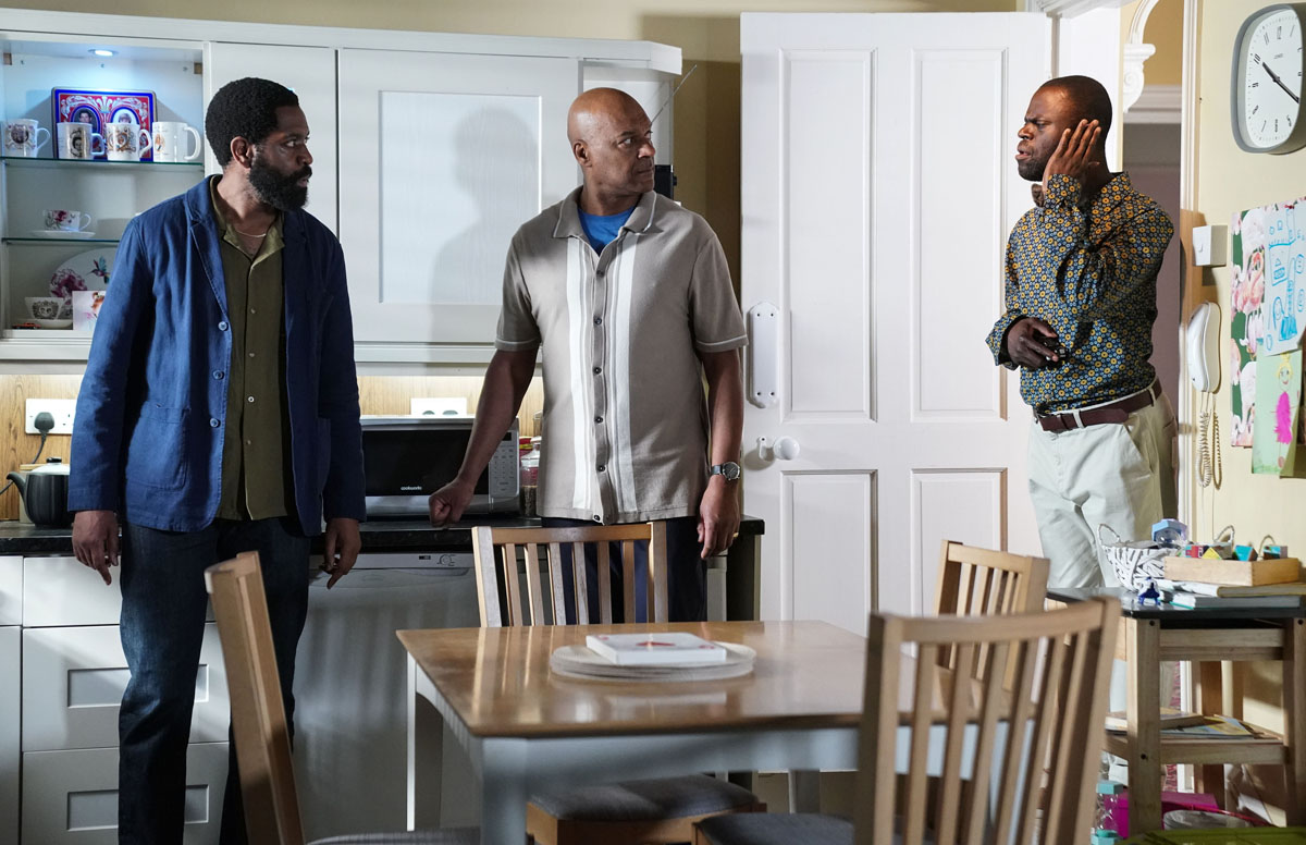 As Kojo (Jonathan Nyati) and Kobina (Dayo Koleosho) arrive at The Vic, George is overcome with emotion to finally meet his biological family members.