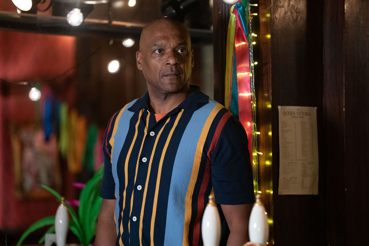 Elaine (Harriet Thorpe) reveals to George that she’s nervous that Kojo will have another outburst, after he spent the night at The Vic following the previous day’s shocking revelations.