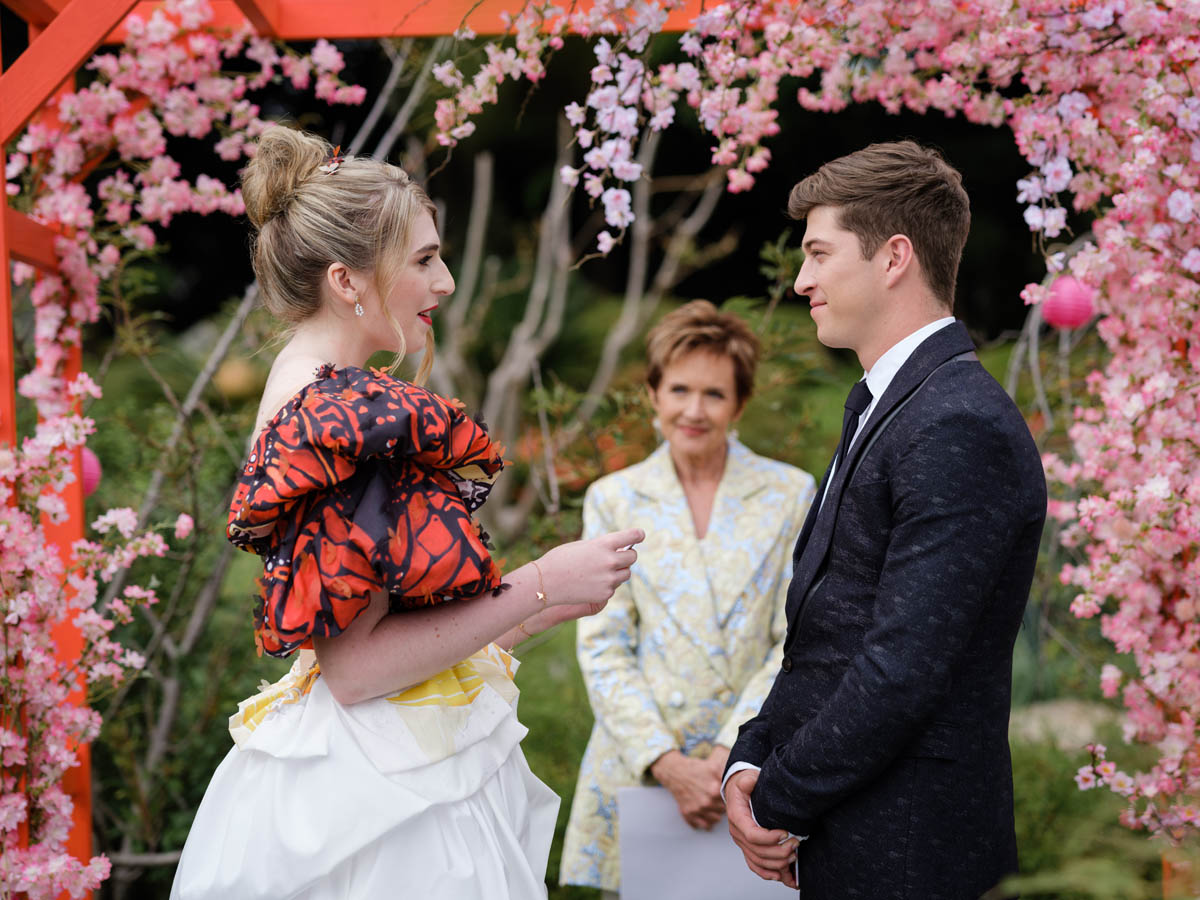 In true Neighbours fashion, it’s on Susan (Jackie Woodburne) to act as celebrant, as she welcomes everyone to the wedding and officiates as Haz and Mackenzie say their vows.