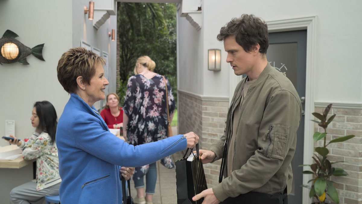 Felix (James Beaufort) is continuing to re-integrate back into Erinsborough, with Susan (Jackie Woodburne) appearing to give him a gift.