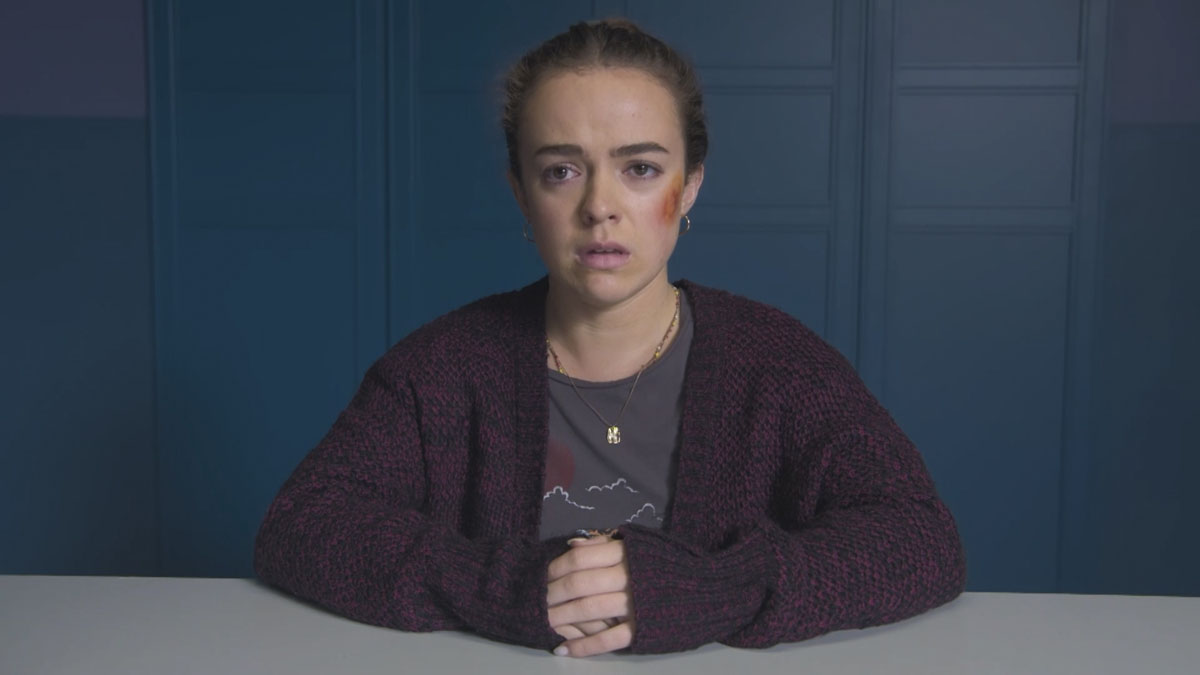 Holly is seen with a bruise to her left cheek, as she awaits her fate.