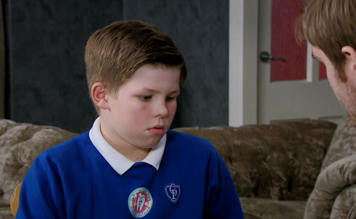 Tom had managed to scare his young cousin with his anger a couple of weeks ago, when Carl revealed that he had given Tom’s tablet—which contained evidence of his surveillance against Belle—to friend Isaac (Bobby Dunsmuir) after they were playing a game on it.