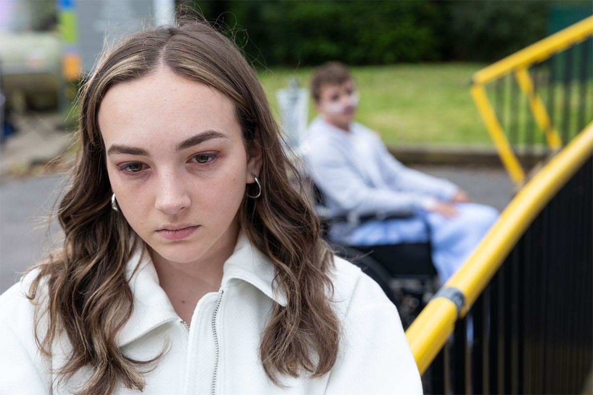Finding him outside, Frankie approaches her brother in his wheelchair, demanding to know the truth about why he abused her.