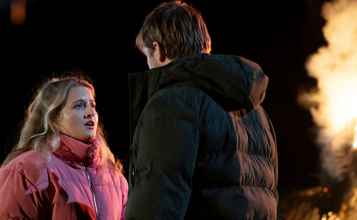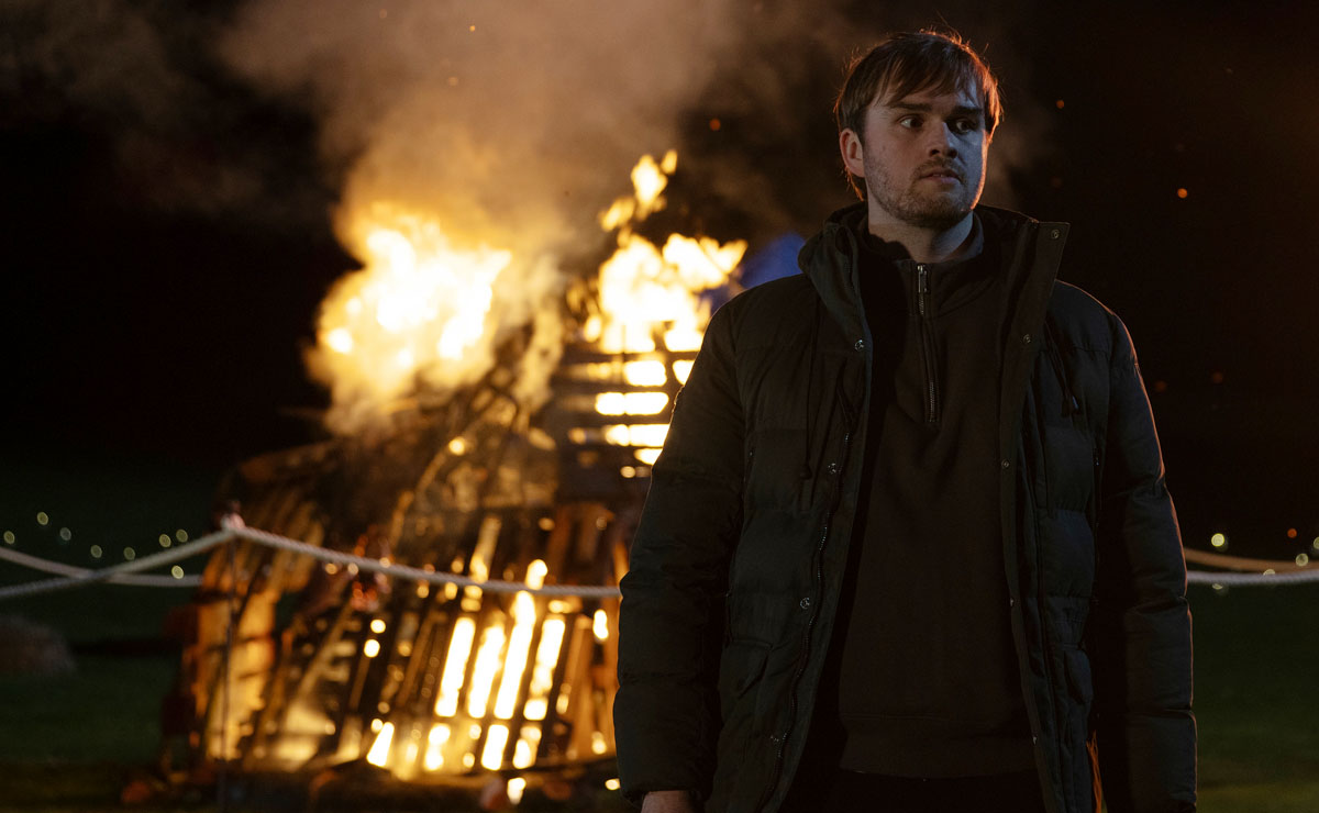 Events take a further turn when Tom attends the village bonfire night with new girlfriend Amelia (Daisy Campbell). As he looks up at the Guy being burnt on the fire, he’s sickened to realise that it has his likeness.