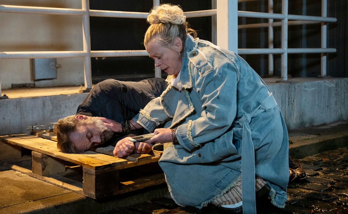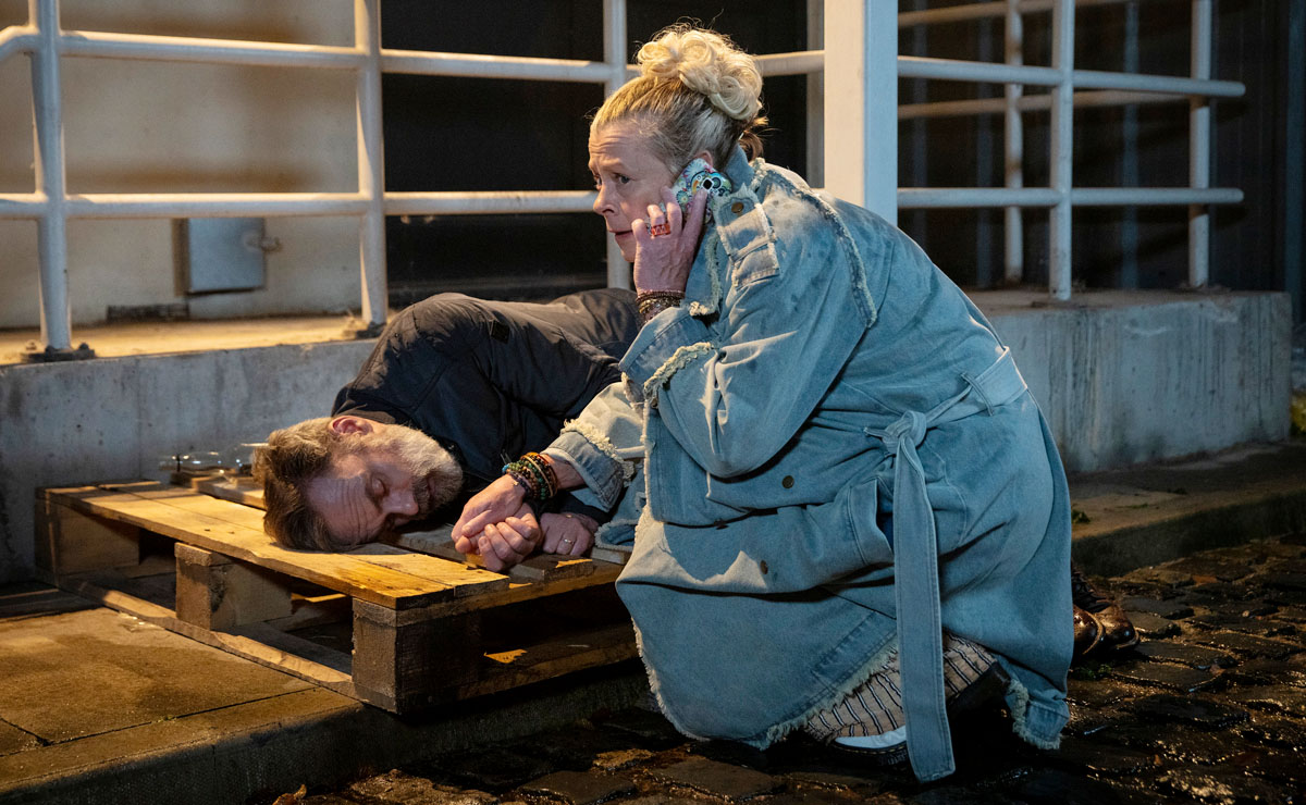 Our lips are sealed as to what happens next, but when Bernie later heads out into the bitterly cold night to try and track down Billy, she eventually finds him lying motionless behind the factory.