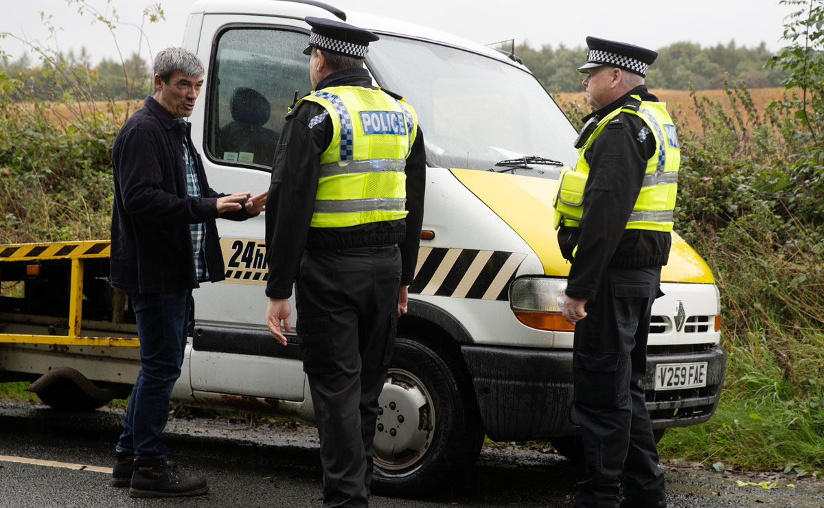 Cain races off, pushing Jai’s (Chris Bisson) car out of the way with his truck as he leaves the garage. But Cain doesn’t get very far before PC Swirling (Andy Moore) pulls him over, having received a complaint from Jai.