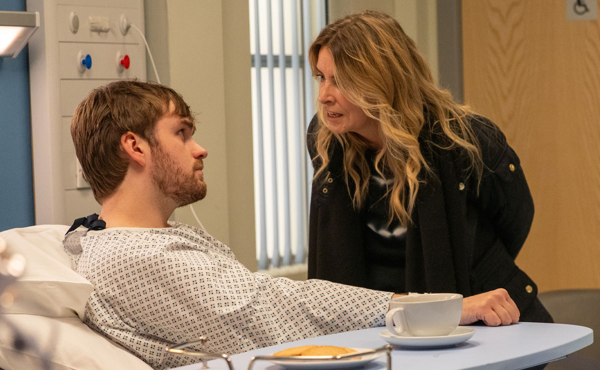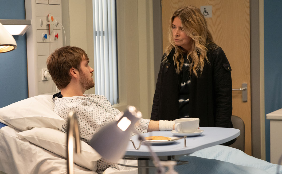 Meanwhile, Charity (Emma Atkins) is in no doubt of Tom’s motives, and uses her skills as a Dingle to sneak into Tom’s guarded hospital room and confront him. Tom’s alarmed by his unexpected visitor, as Charity makes it clear that she knows he’s faked his suicide attempt in a bid to garner sympathy and derail the trial.