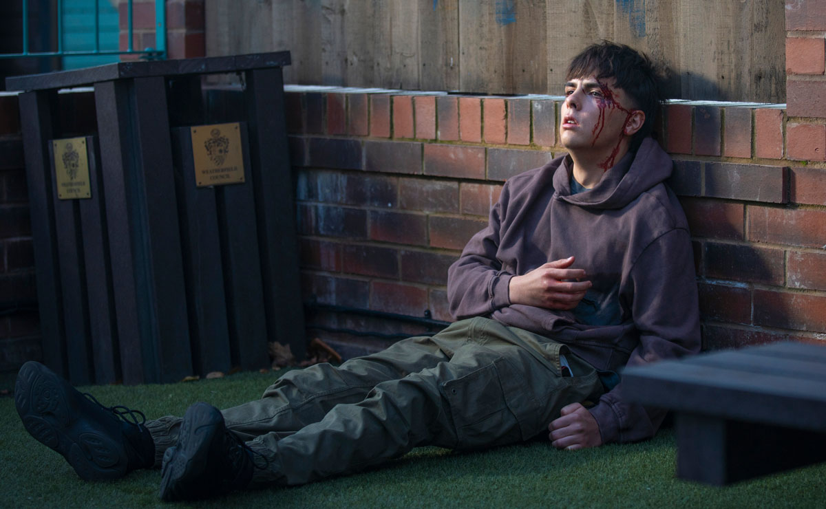 A battered Mason slumps to the ground in the children’s play area, bleeding from the wound. Abi comes across him and does her best to stem the bloodflow with her scarf as she calls out for help.