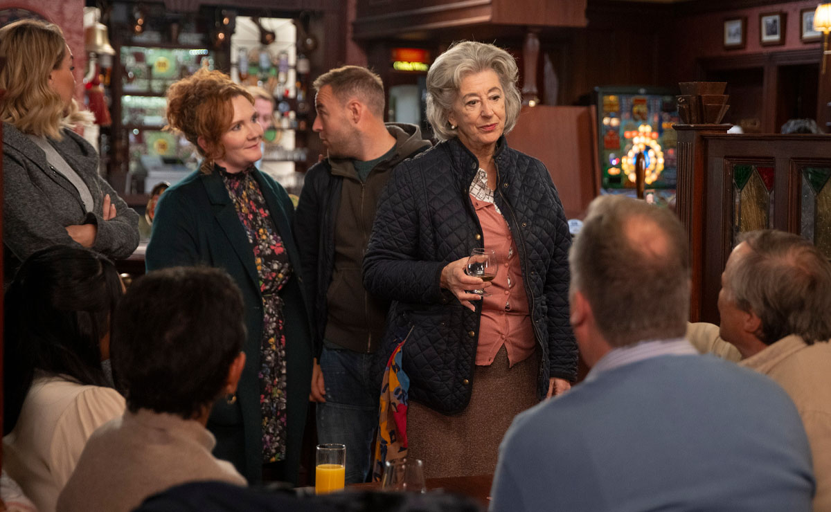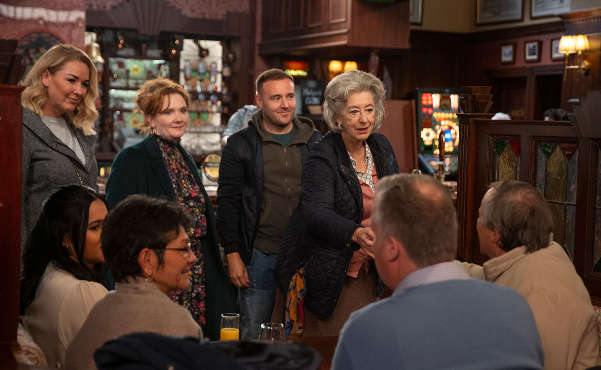 When Tyrone and Fiz (Jennie McAlpine) later call in the Rovers, they find Evelyn having a farewell drink with Roy, Yasmeen and Brian (Peter Gunn).