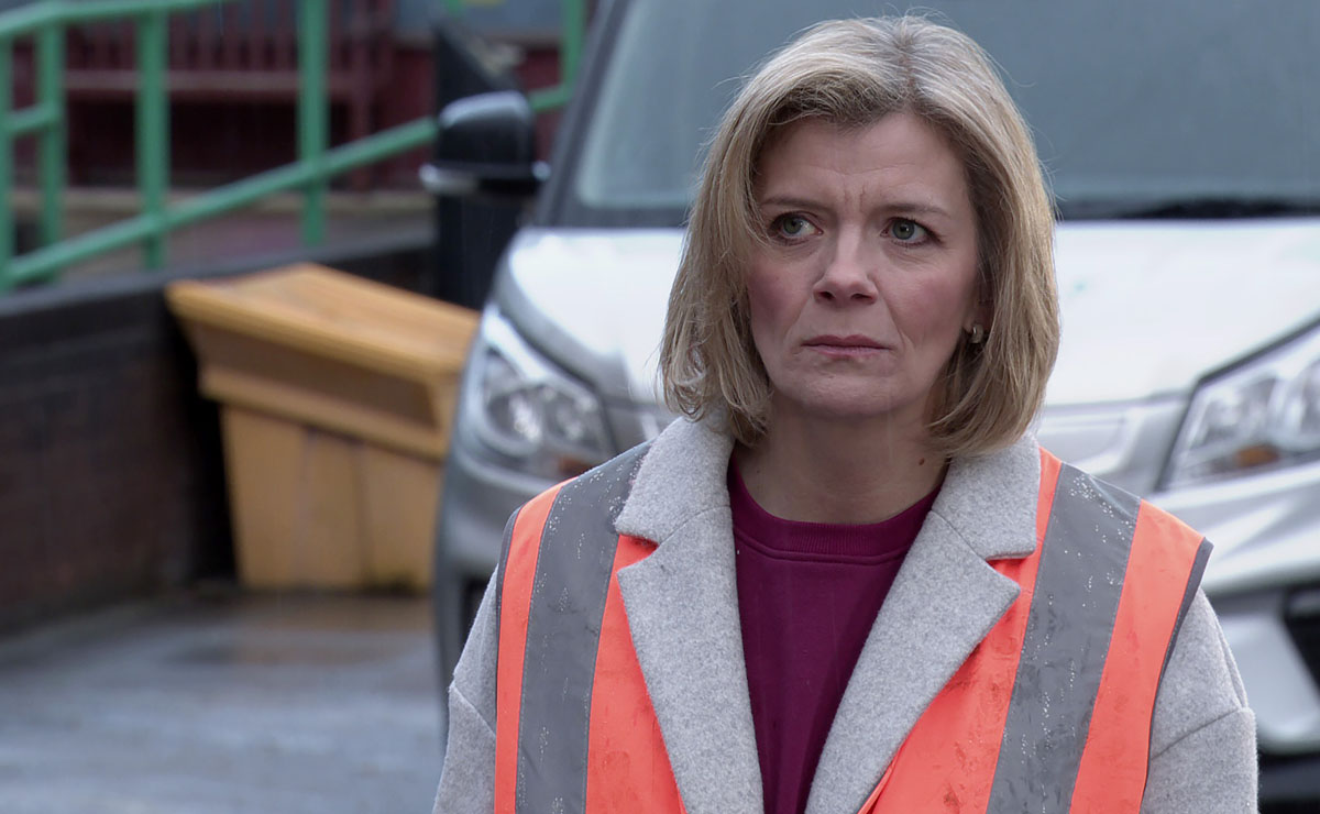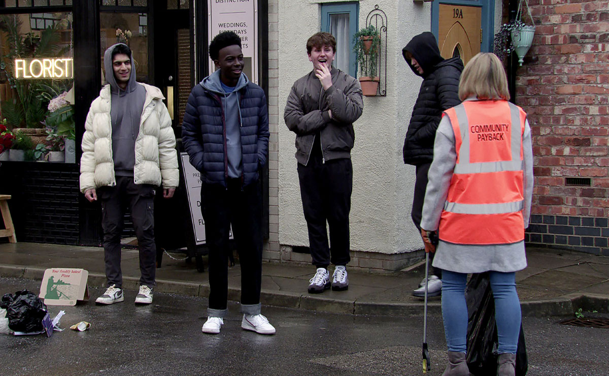 Leanne is very self-conscious as she dons her high-vis jacket to start cleaning up around Rosamund Street, as she deals with a group of uncouth youths heckling her.