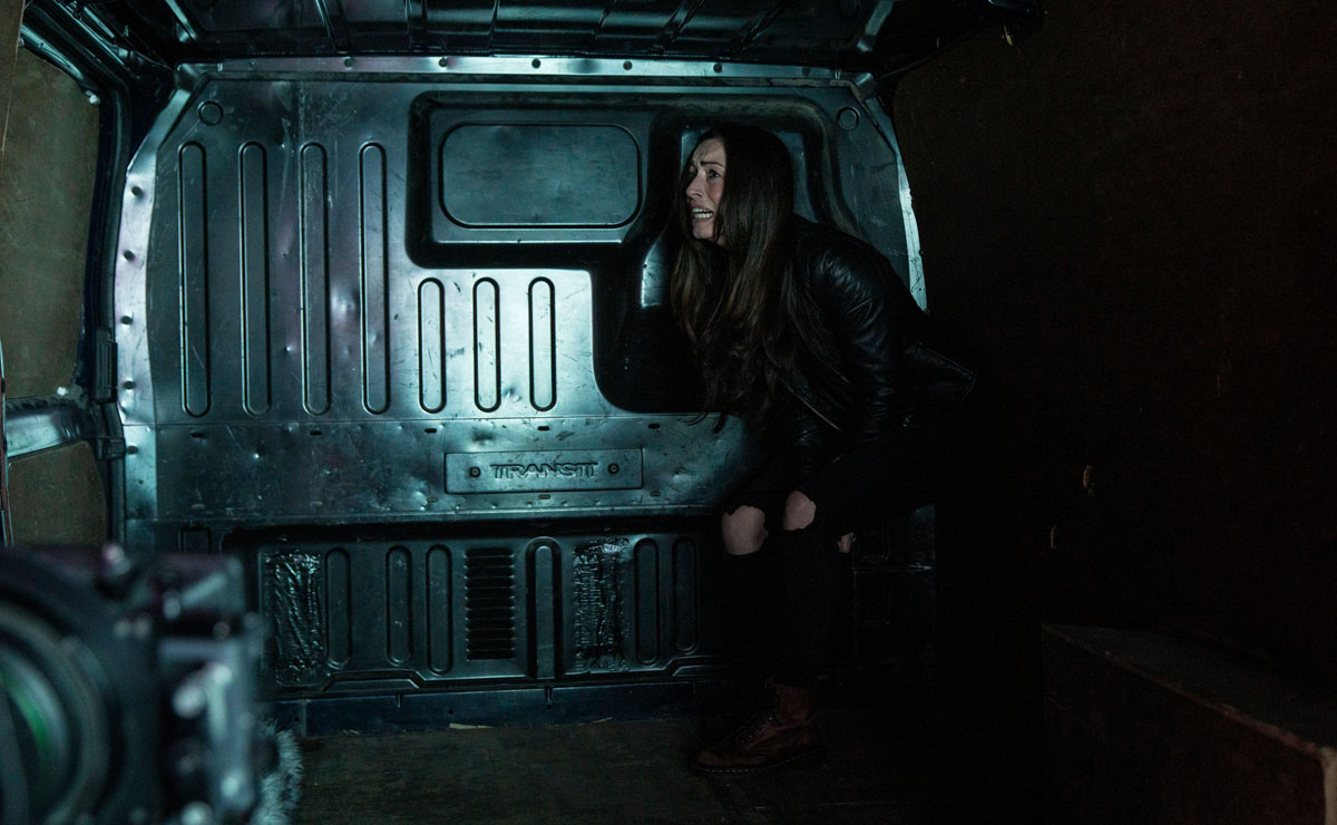 In the back of the van, Shona desperately shouts out for help as she bashes on the door, but it’s to no avail.