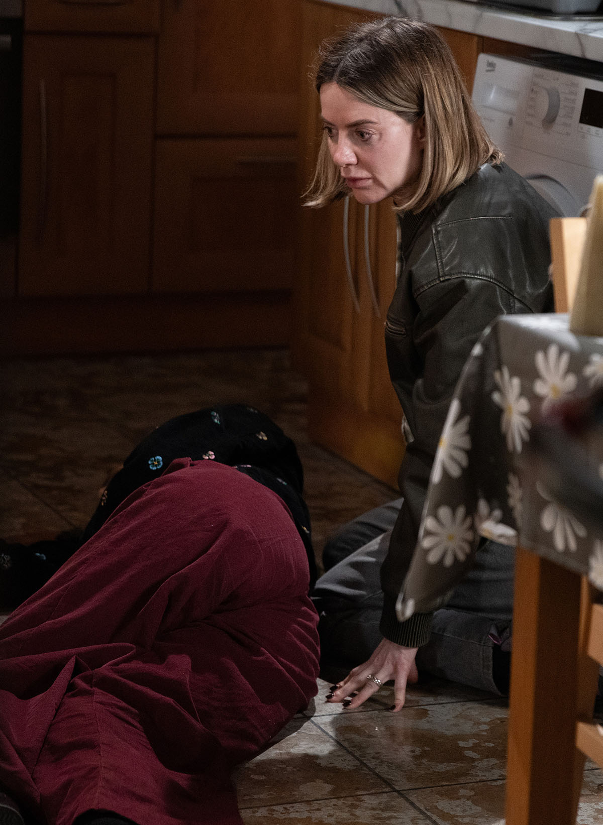 When Leanne (Jane Danson) arrives on the scene, clearly inebriated, she tries to check on her sister but an annoyed Nick sends her away.