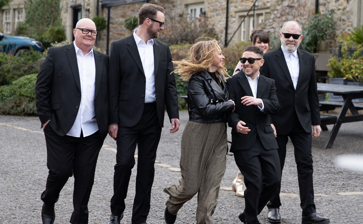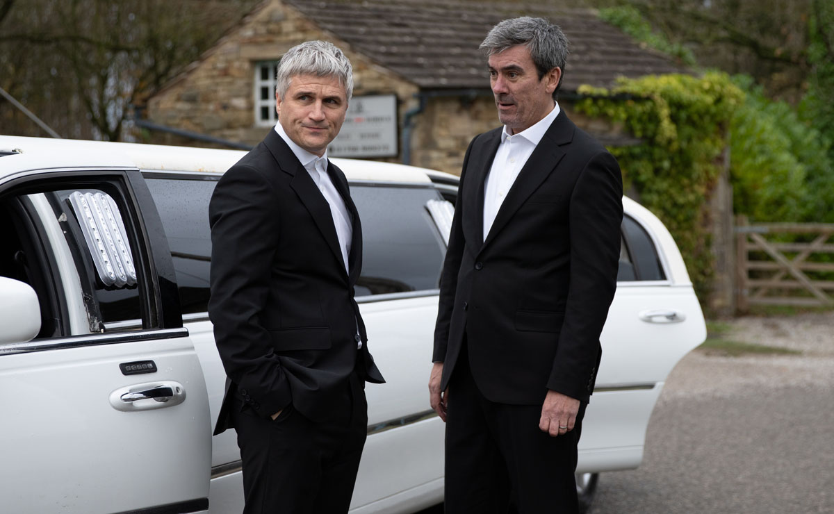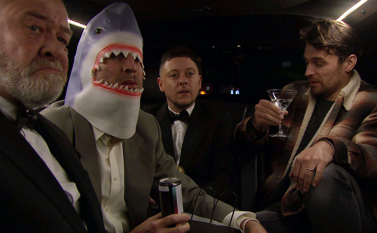 Passengers for Caleb’s limo are Liam, Cain, Paddy (Dominic Brunt), Sam (James Hooton), Matty (Ash Palmisciano), Bear (Joshua Richards), and Mackenzie (Lawrence Boyd), all of whom other than the latter are suited up.