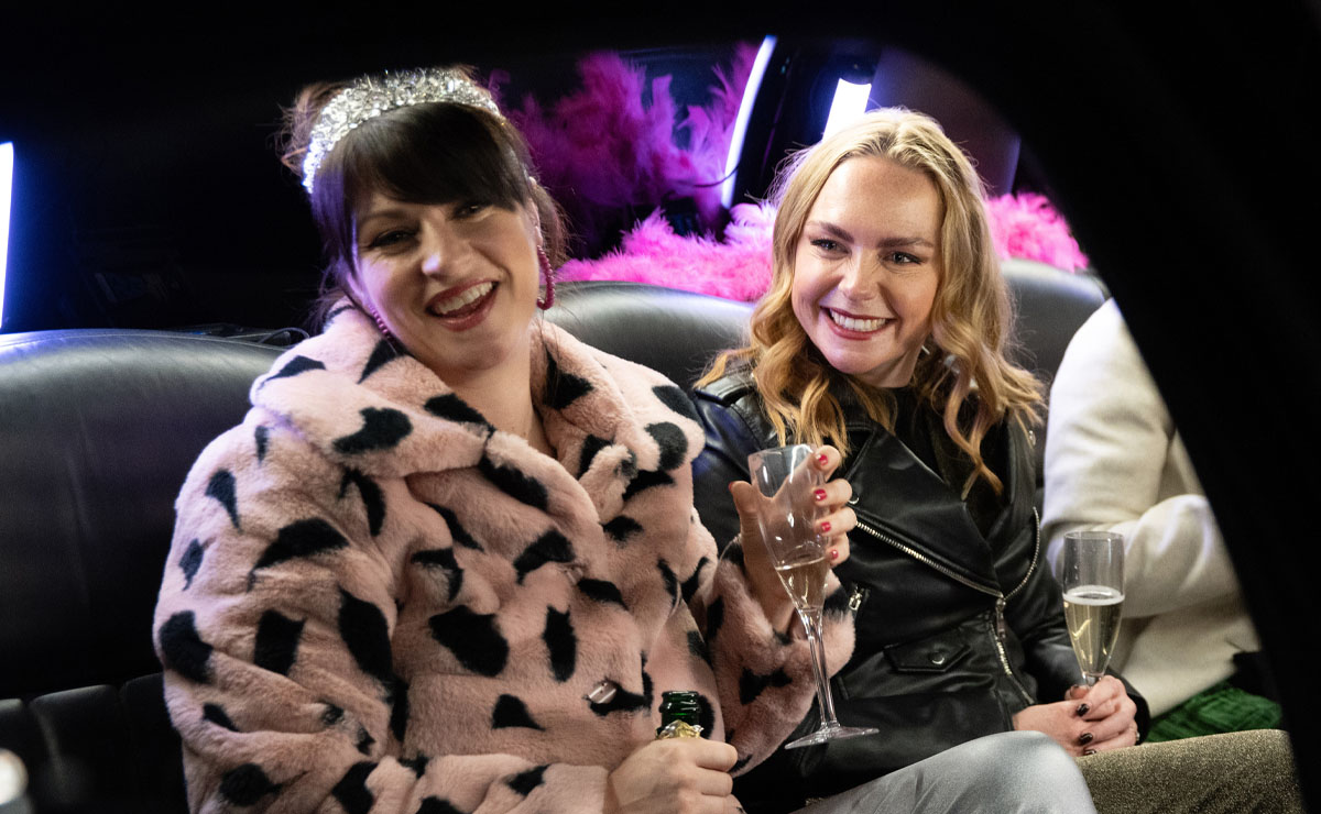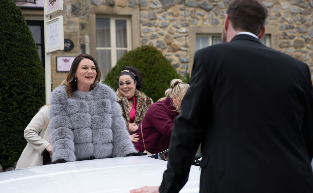 Over in the ladies limo, Kerry, Leyla, Chas, Suzy, Mandy (Lisa Riley), Amy (Natalie Jamieson), Vanessa (Michelle Hardwick), Tracy (Amy Walsh) are looking equally as glam, but both limos end up having their departures delayed when Mandy has to take care of an unforeseen issue.