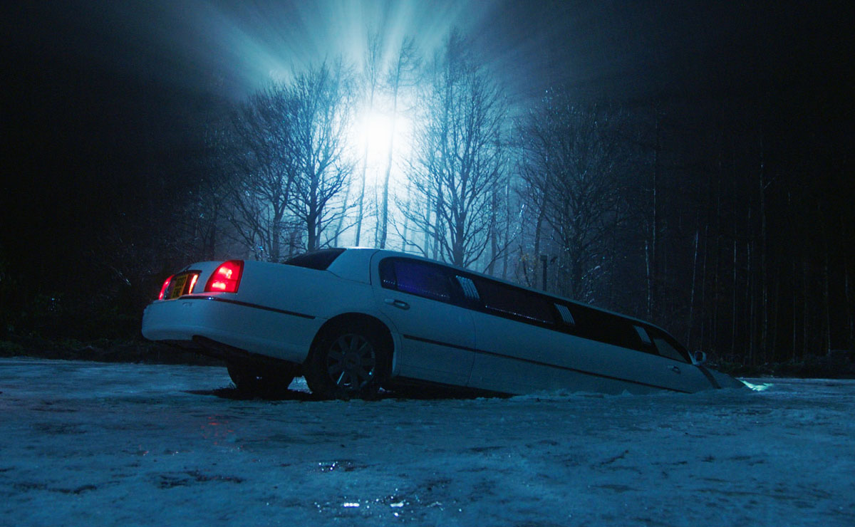 As silence falls on the scene, one of the limos has managed to find itself crashing onto a frozen lake. Slowly the ice cracks, as the front of the limo begins to sink into icy water below…