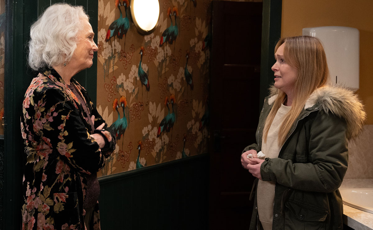 Later in the week, Charity (Emma Atkins) can see that her granddaughter is subdued, so asks what’s wrong. Will Sarah confess to Charity that she could be about to become a great-grandmother?