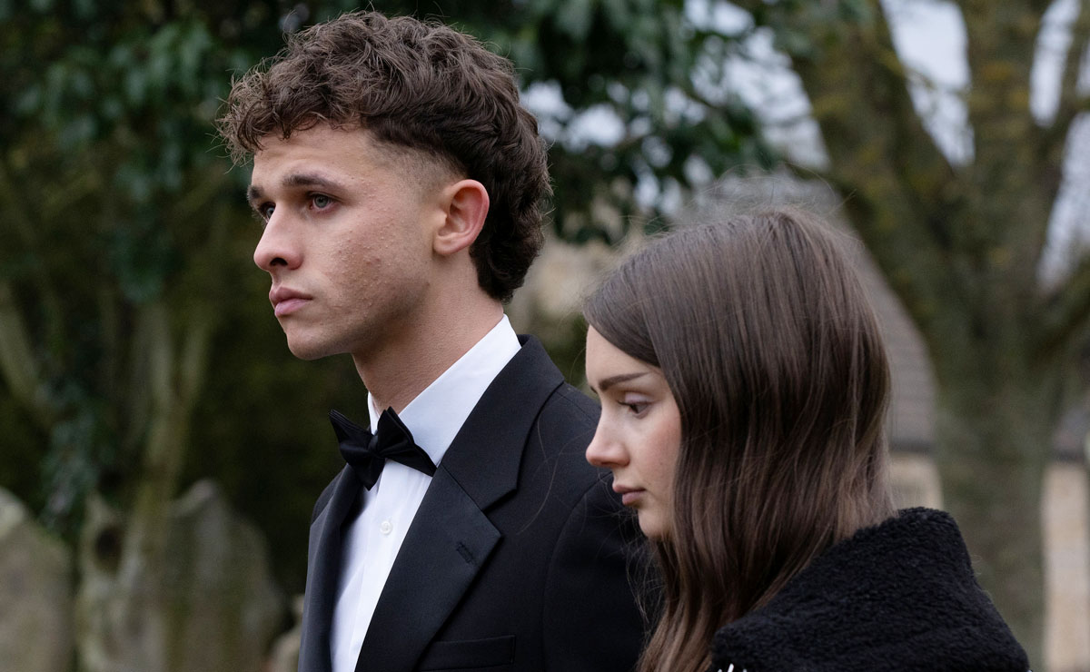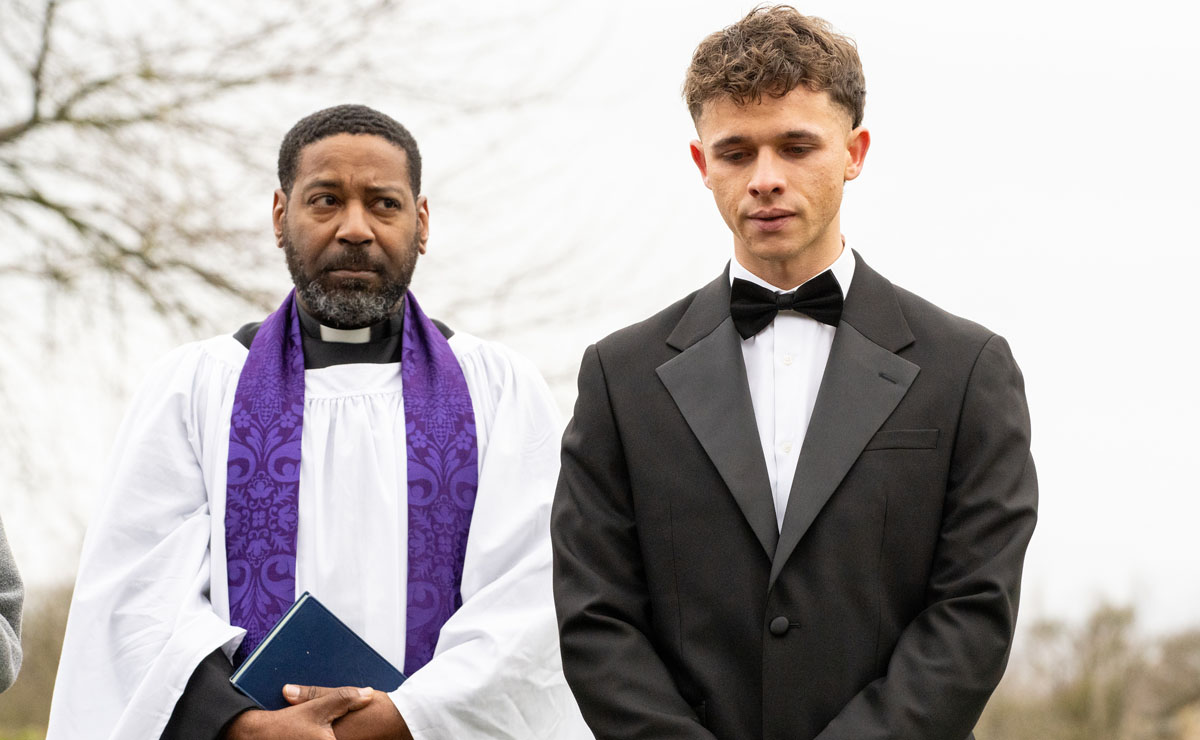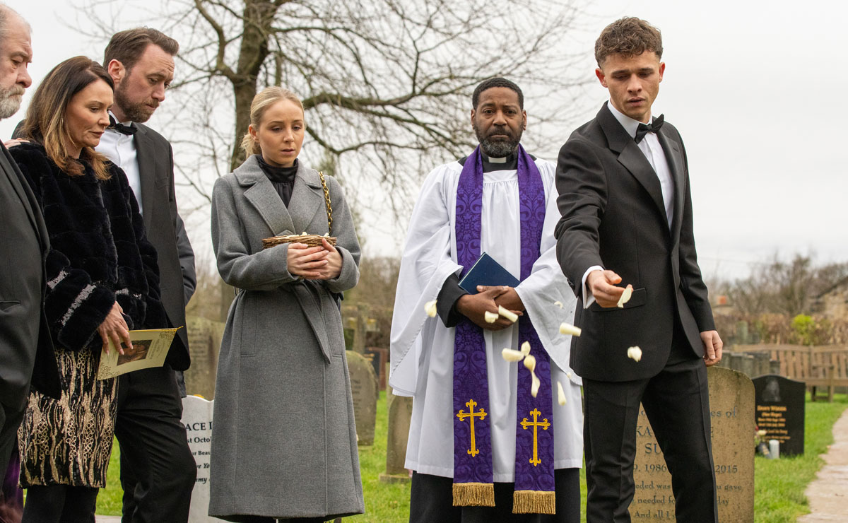 Elsewhere, other villagers gather for Amy’s (Natalie Ann Jamieson) intimate funeral, tucked away in a woodland setting.