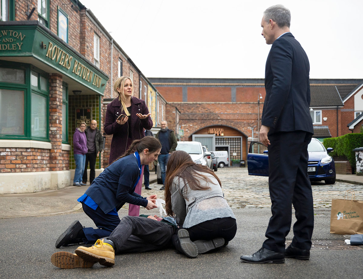 When 2pm finally comes around, David exits the Rovers and stumbles the few steps over to Rosamund Street to meet his fate, just as Shona arrives on the scene.