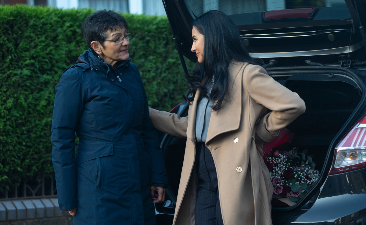 “Here she is now,” Yasmeen announces, as Alya turns around to find Leanne (Jane Danson) standing beside her!