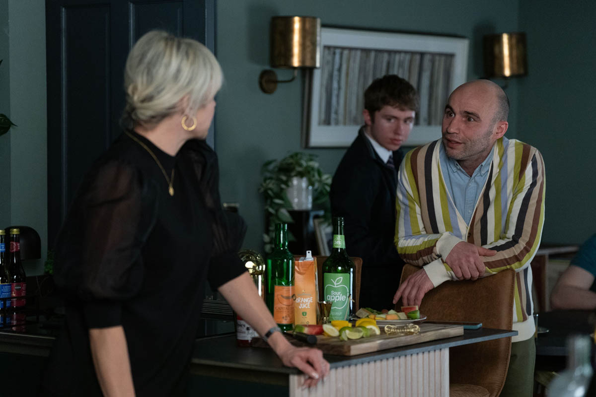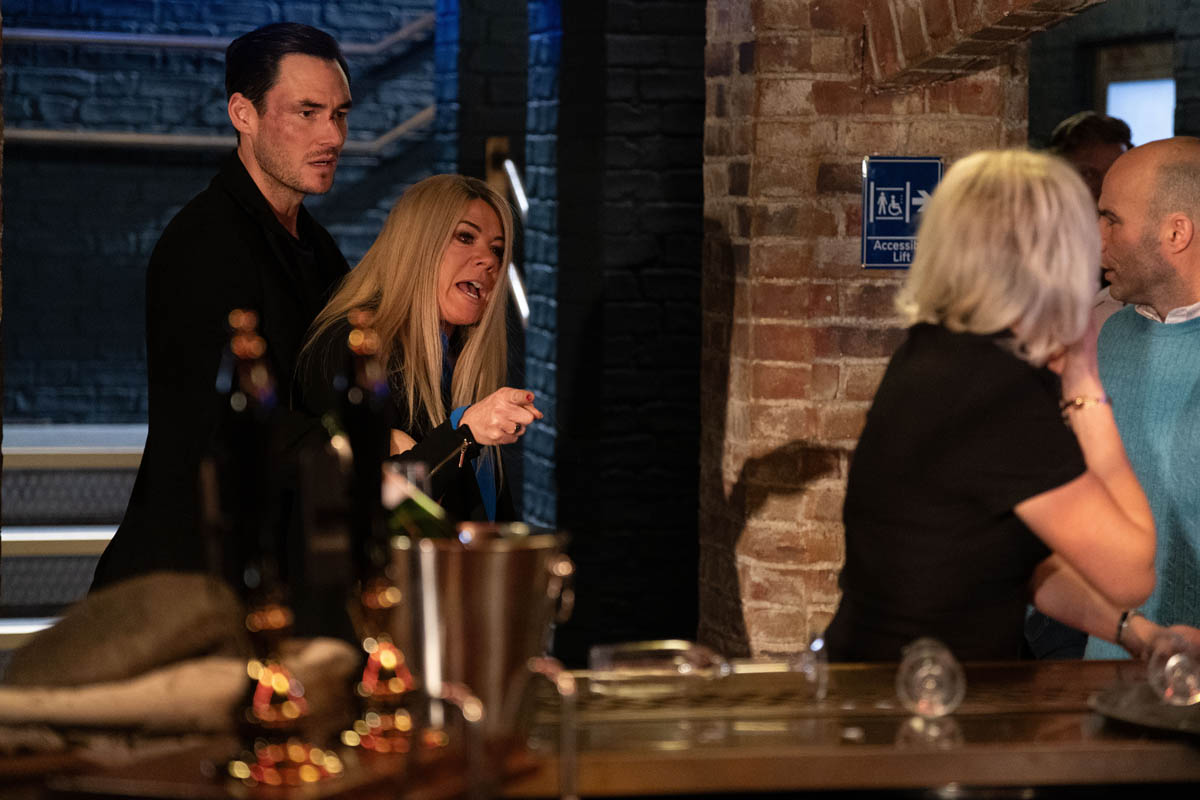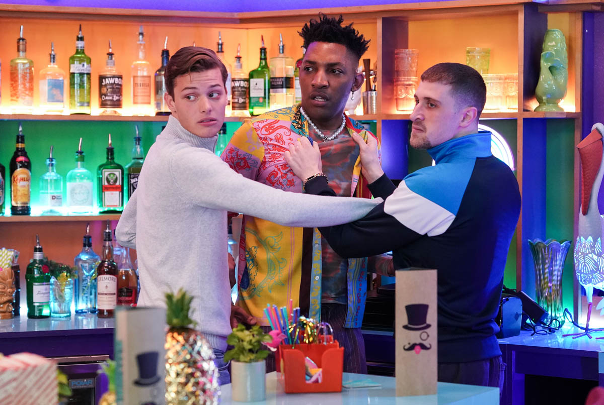 Harry, still worse for wear and spiralling, makes a show of himself as he picks a fight with Felix (Matthew James Morrison) at The Albert.