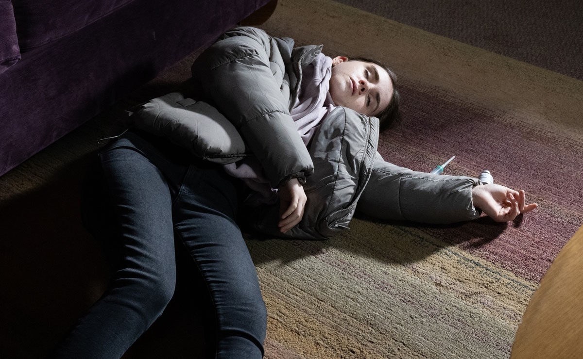 The next day, April sneaks in the veterinary surgery and takes another vial of ketamine, and when Marlon later returns home, he’s horrified to find April passed out on the living room floor with the empty vial beside her!