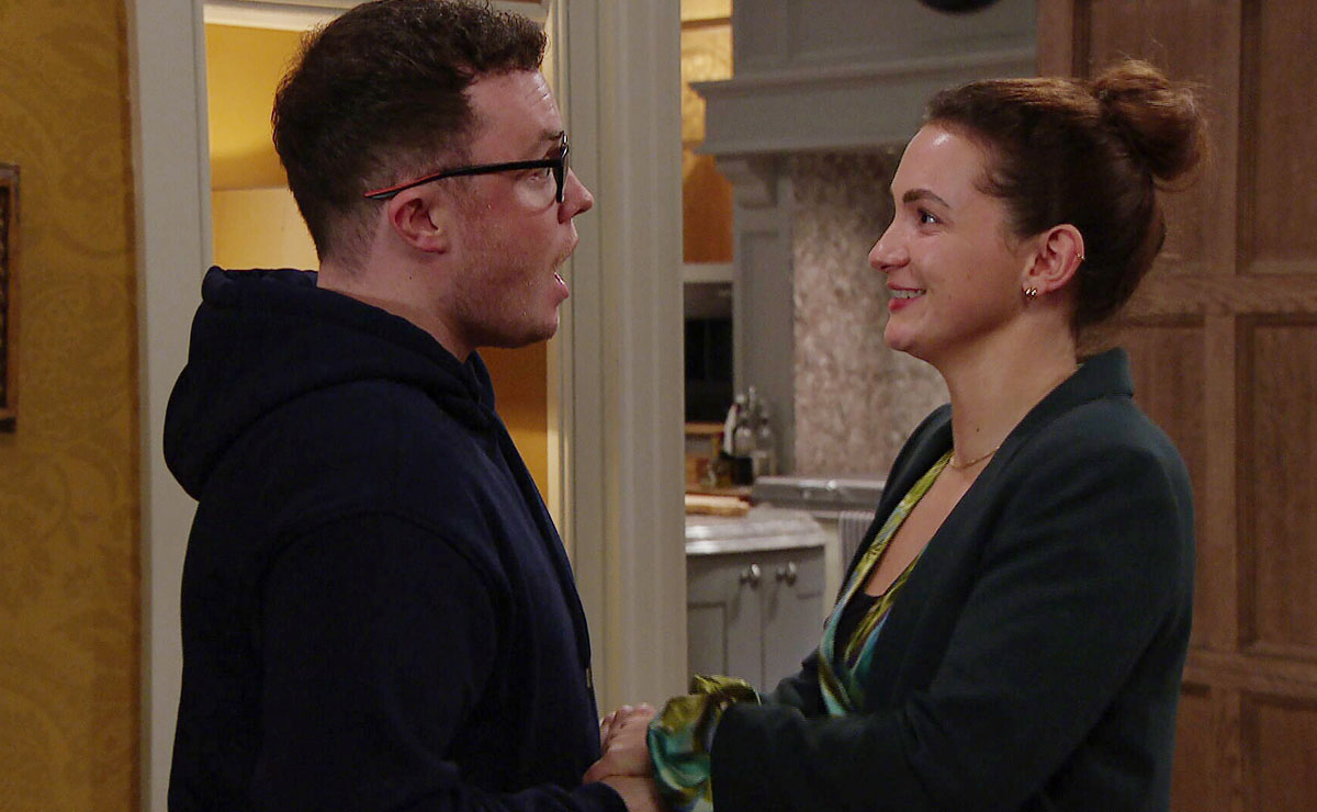 Gabby’s delighted when boyfriend Vinny (Bradley Johnson) suggests that he could move into Home Farm with her and help out.