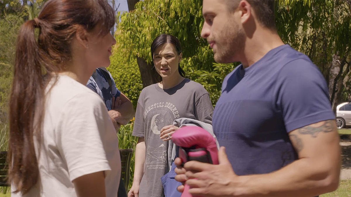 The photos also show Wendy looking concerned as Andrew talks with Sandra (Natassia Halabi), one of his self-defence students.