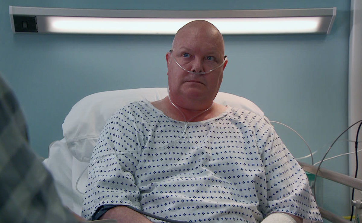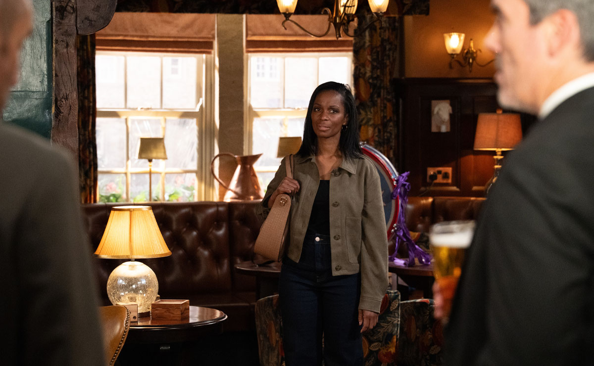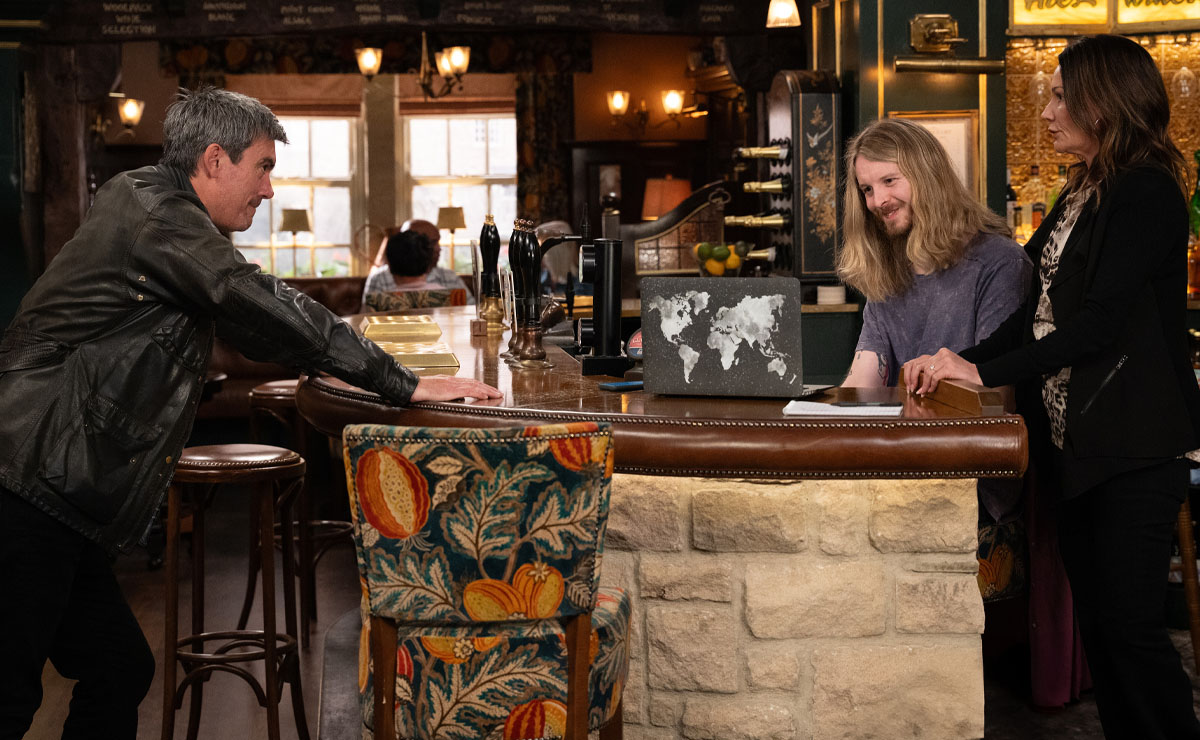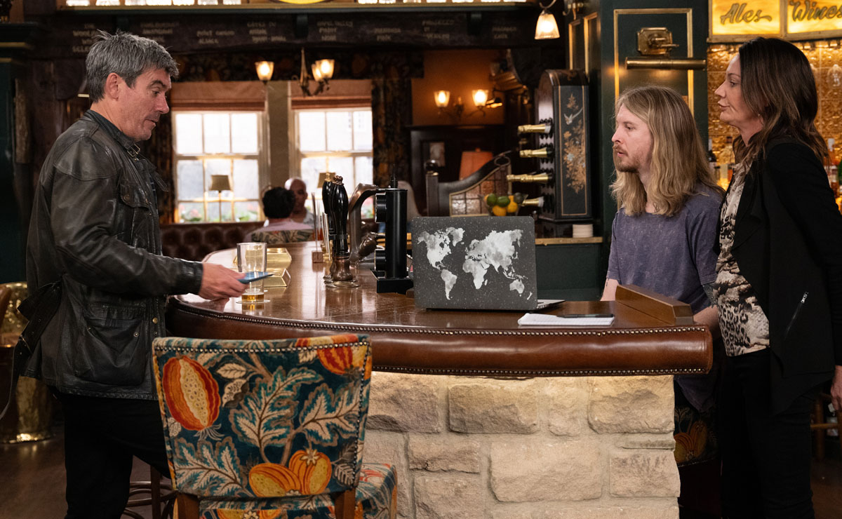 Determined to do whatever it takes, Cain arranges to meet someone from a local surrogate group privately at The Woolpack. But as time goes on and the woman is a no-show, Ryan (James Moore) is forced to break the news to Cain that he’s been scammed.