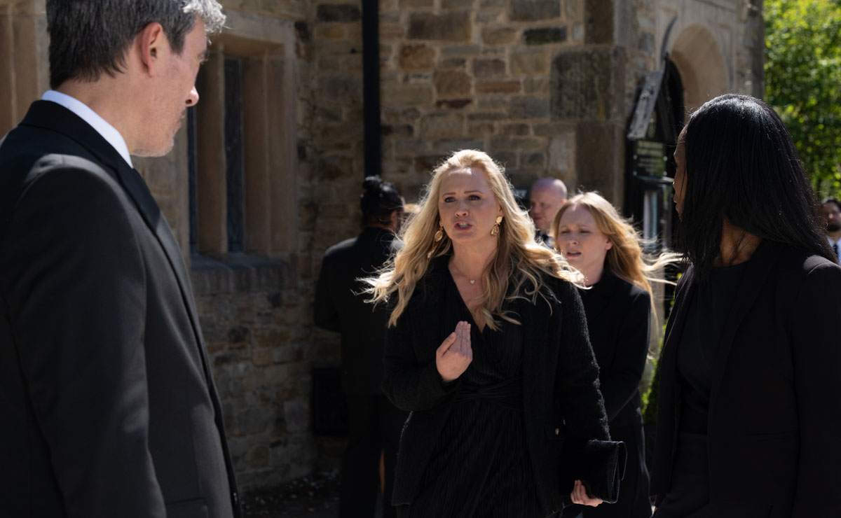 The following day, a small group of mourners led by Tracy and Cara gather outside St Mary’s. Tracy’s already rattled—and spotting DS Walsh (Amanda Ryan) watching from a distance only makes things worse. Her nerves are shot, but she attempts keeps a lid on it as the hearse pulls in.
