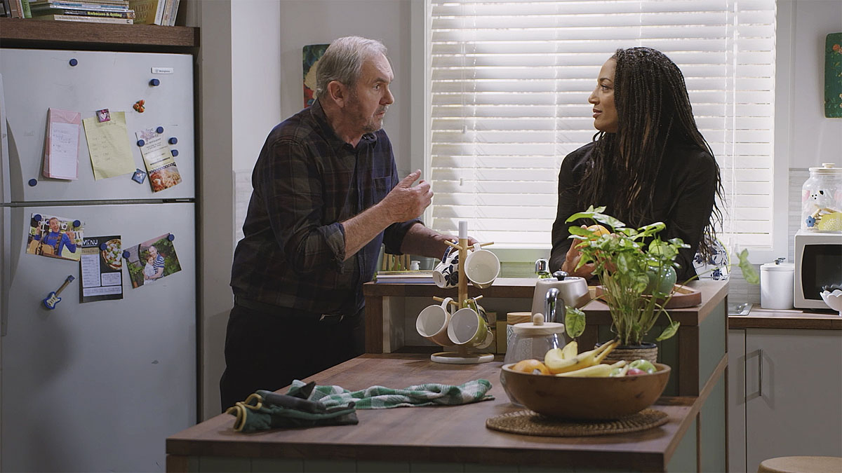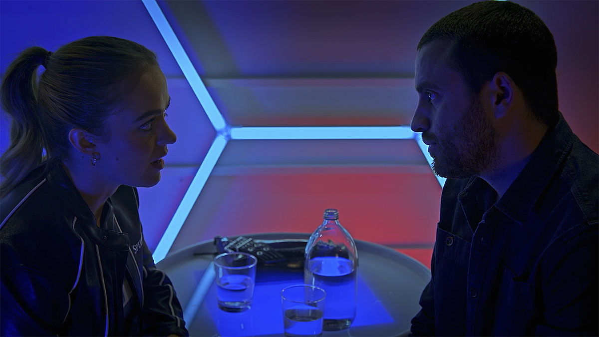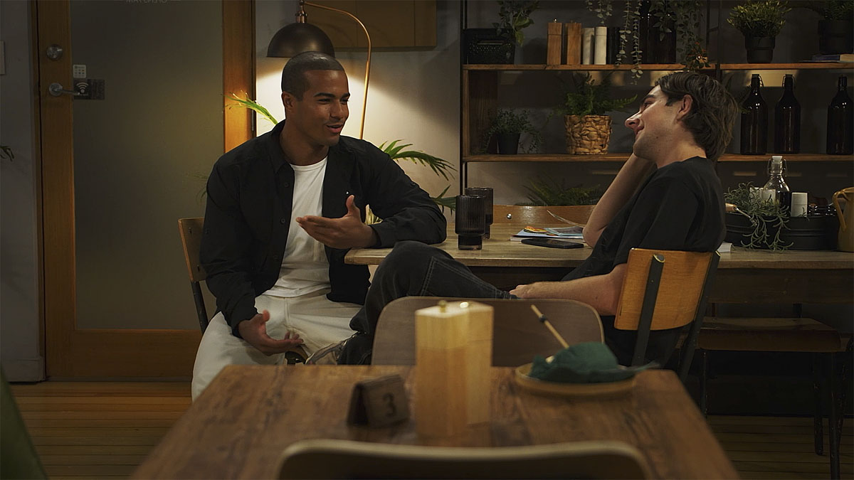 Later, Aaron and Andrew have a serious heart-to-heart in the living room of No. 24 – as Andrew explains his behaviour, can he talk Aaron into keeping quiet?