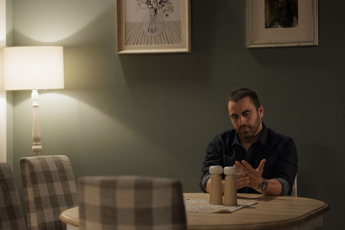 We then see him playing with his wedding ring, as he thinks through what he’s done, and what he’s putting his friends and neighbours through.