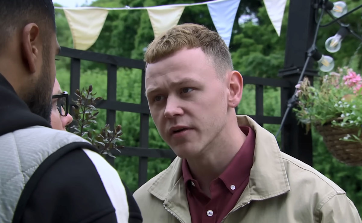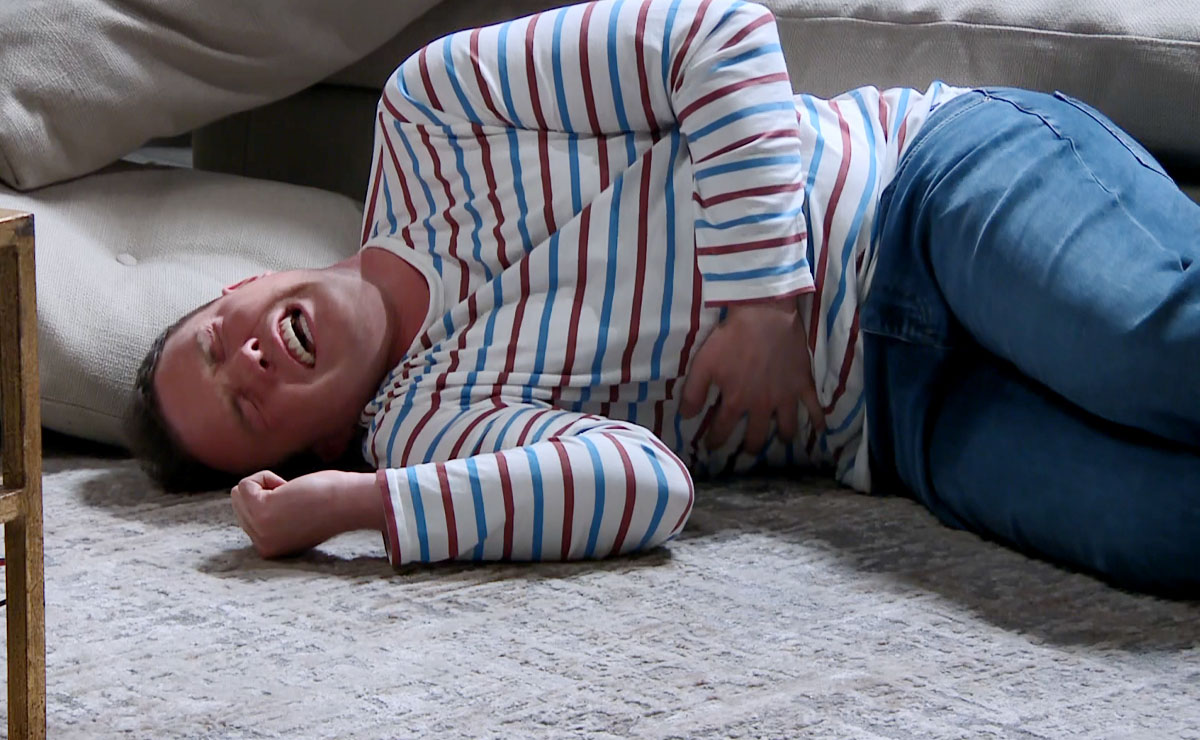 Meanwhile, over in the allotment, Liam (Jonny McPherson) finds himself in a pickle when he’s finds himself urgently needing the toilet.