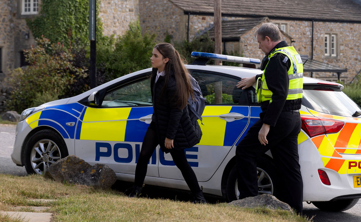 As April’s dropped off, Rhona (Zoe Henry) is puzzled to see her step-daughter arriving home in a police car, demanding to know what’s going on.