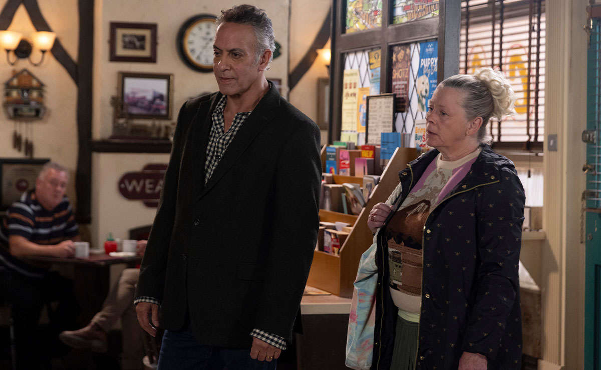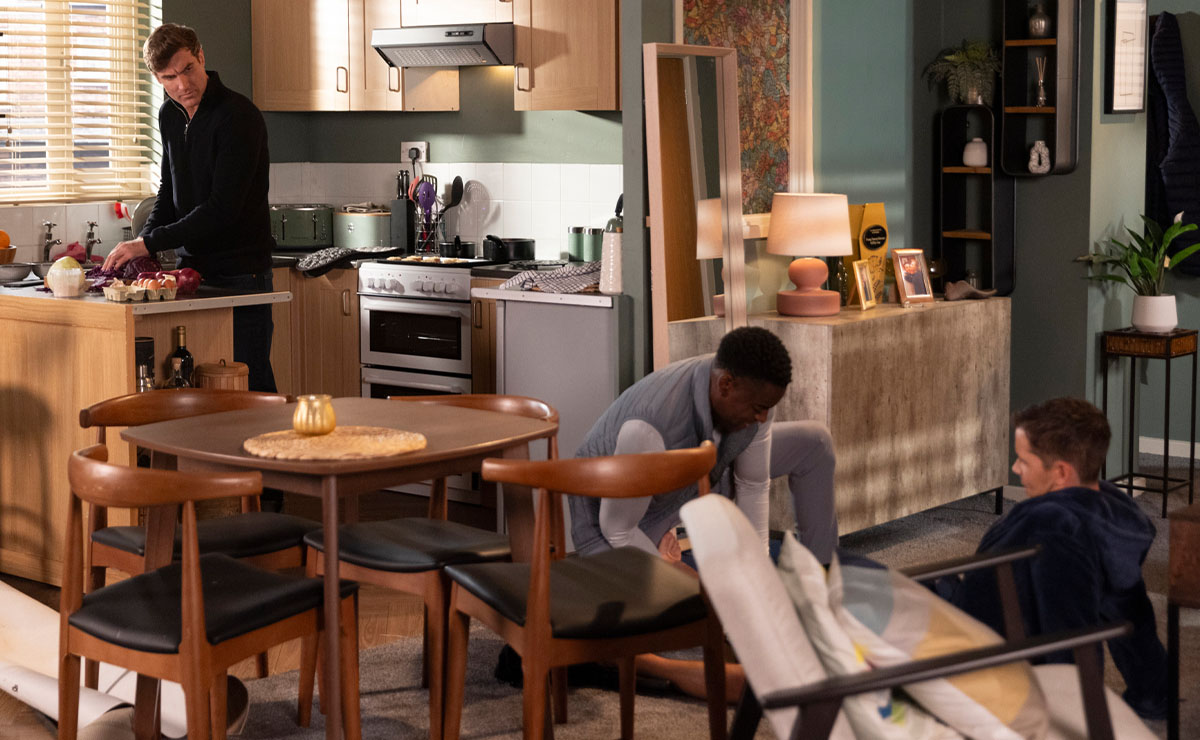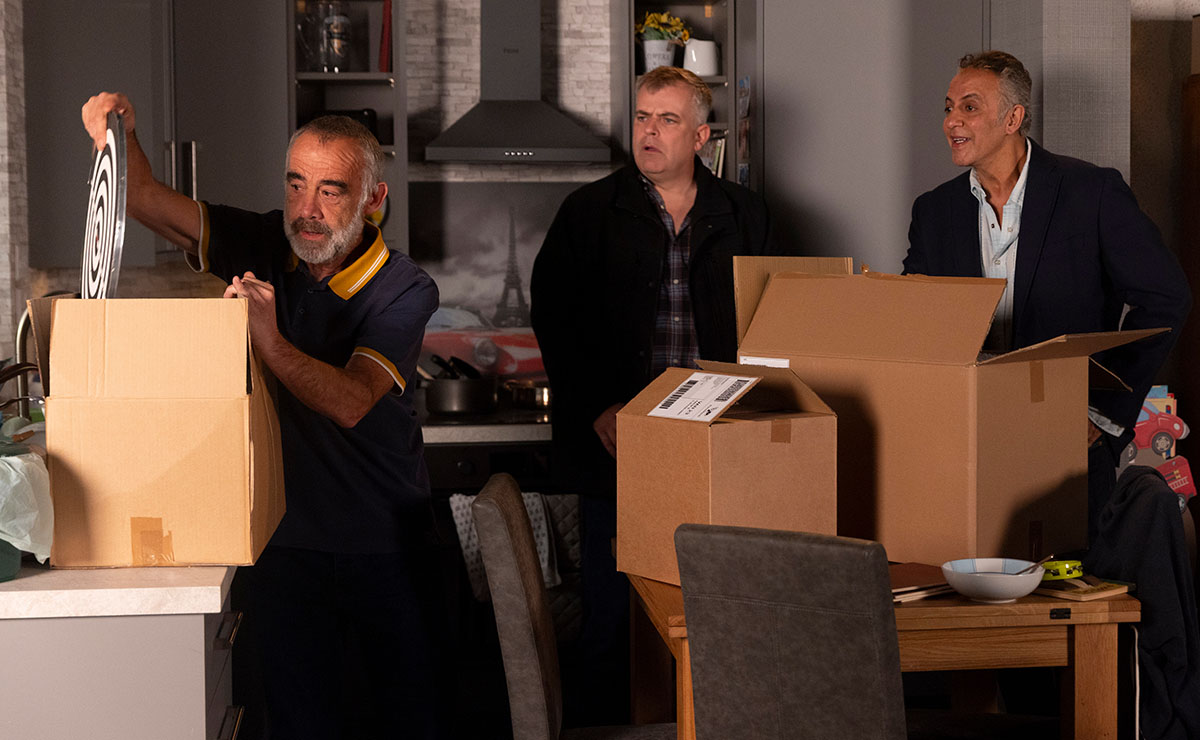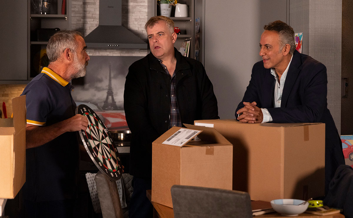 He proudly unveils a barrel of beer and a dartboard to Steve (Simon Gregson) and Dev, explaining that he’s building his own makeshift pub at home—a safe haven where he can spare himself any further awkward encounters with his brother and ex!