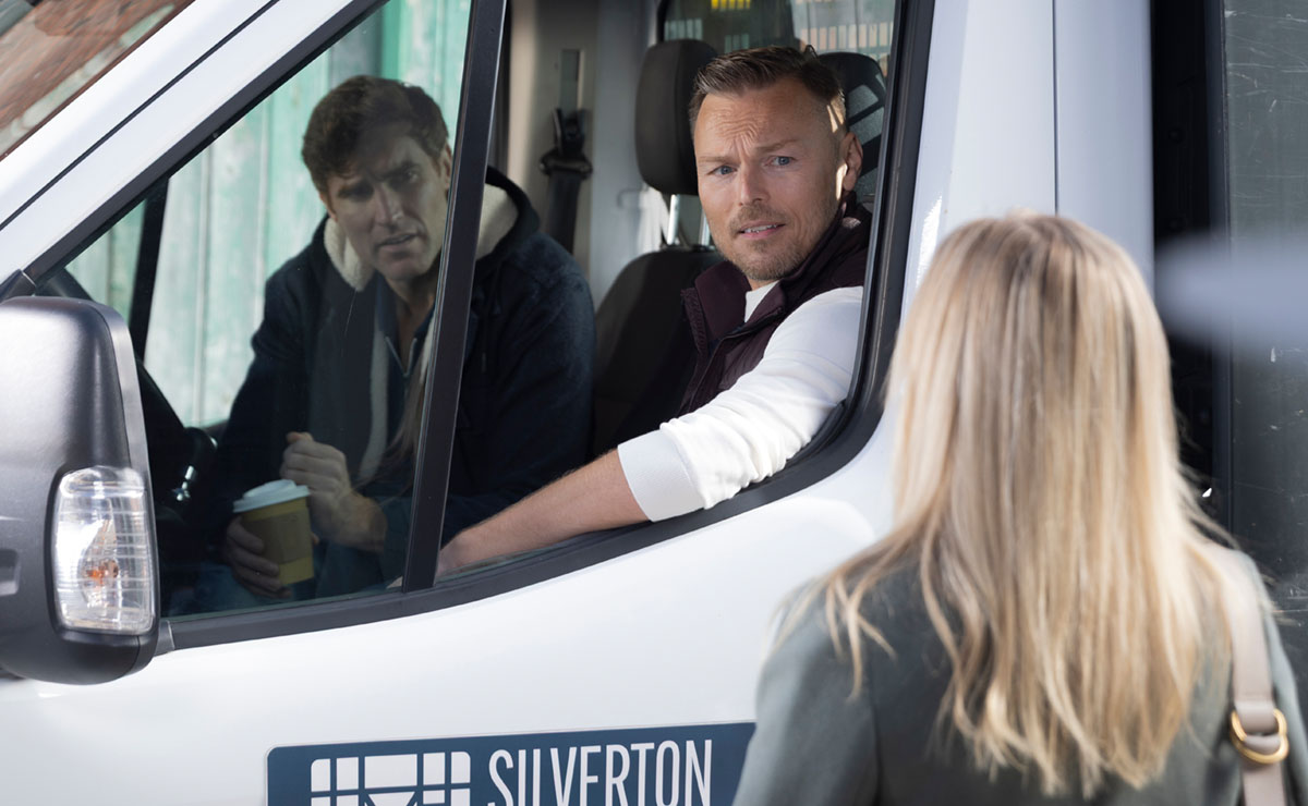 Sarah (Tina O’Brien) soon spots the truth for herself when she catches Theo and Pete looking far too friendly as they climb into a van together. She knocks on the window, demanding an explanation from Theo.