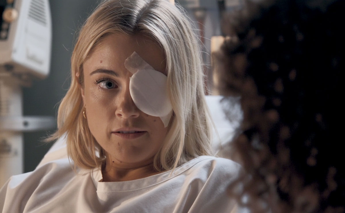 Harper has been sporting an eyepatch for the past couple of weeks, since a moment of spectacularly bad timing saw her enter the pier apartment just as Sonny had popped a champagne cork in the direction of the door.