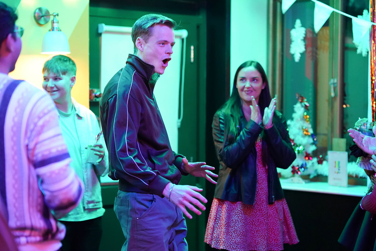 The following day, as Phil and Julie (Karen Henthorn) head to The Arches to begin recording Nigel’s ‘Santa Claws’ film, Sam puts her new plan into action.