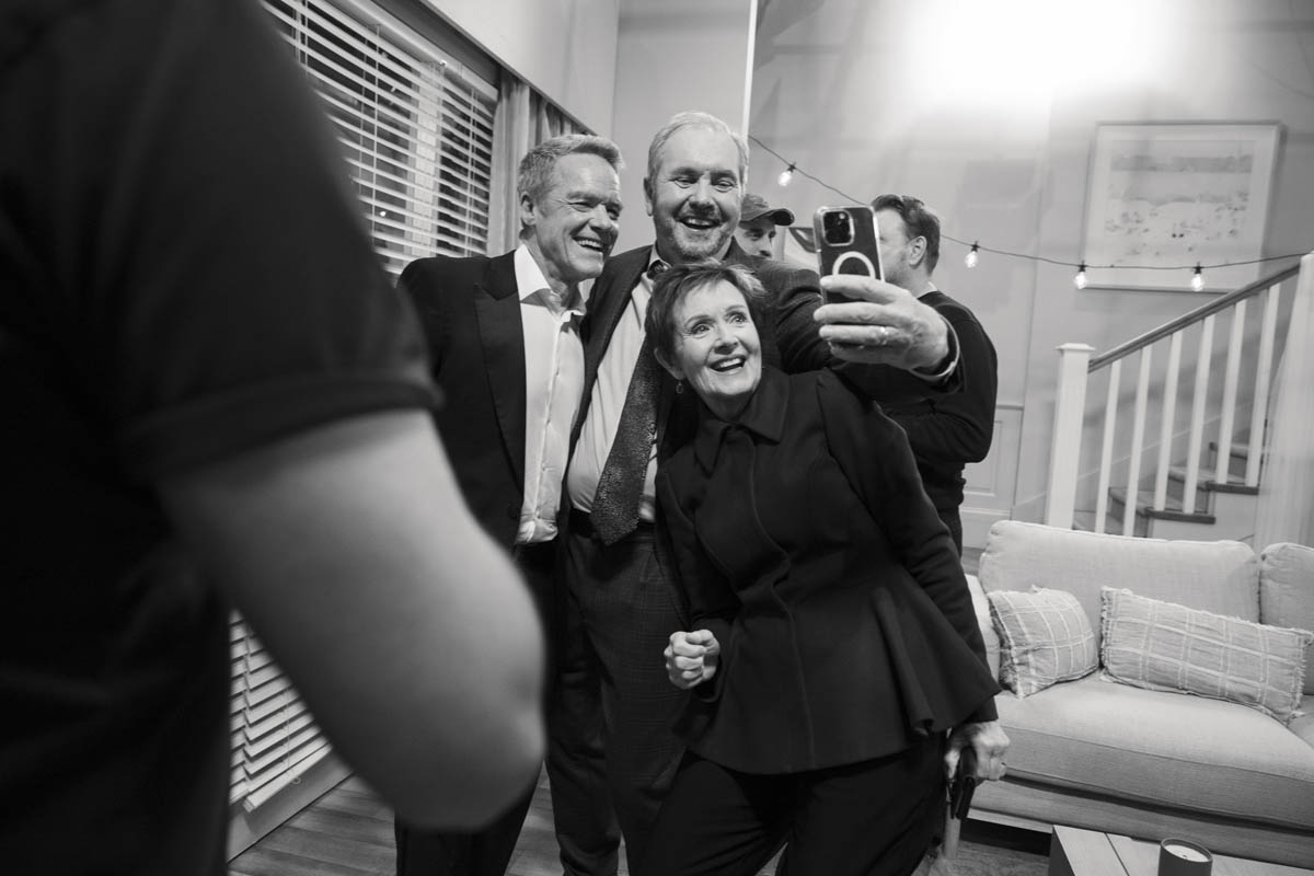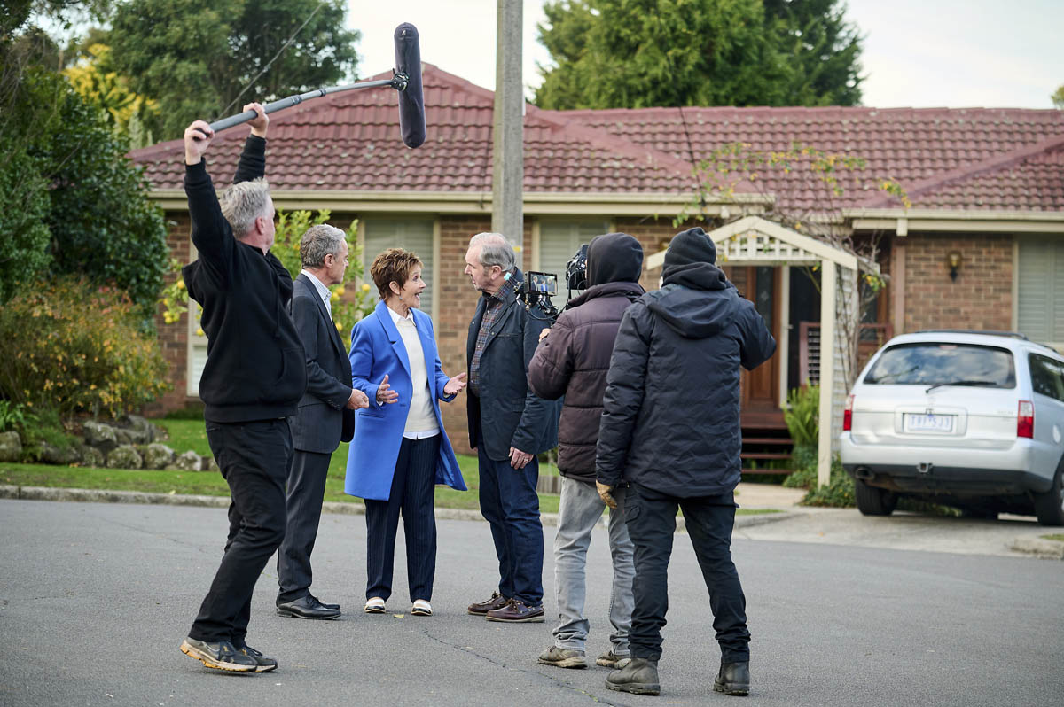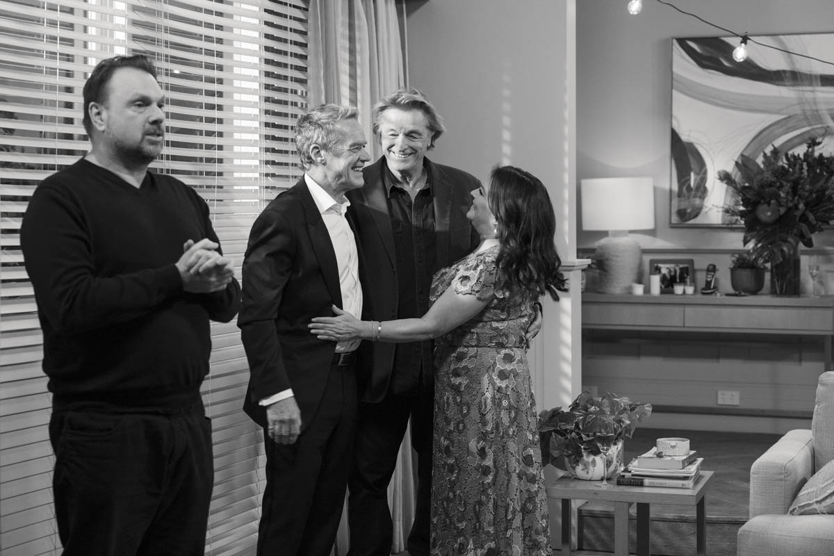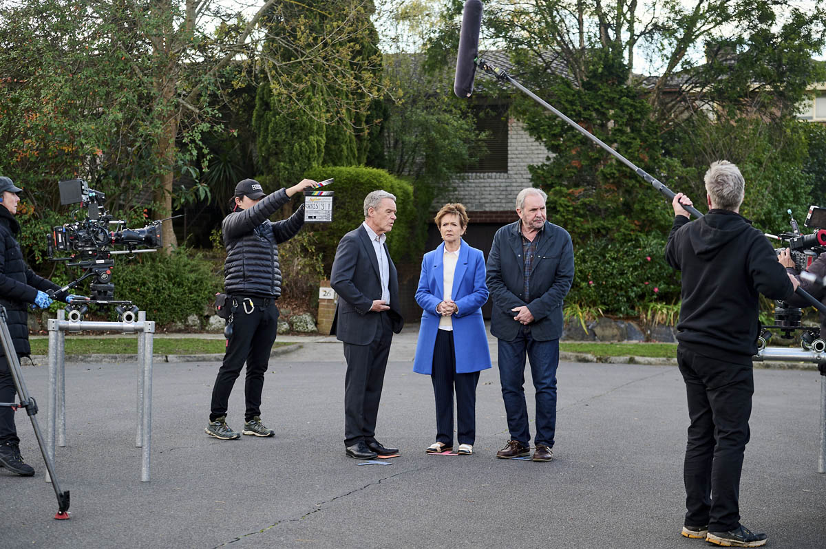 Jason Herbison, Exec Producer, alongside Stefan Dennis, Peter O’Brien and Rebekah Elmaloglou after the final internal scene was filmed. Allena Tran / Prime