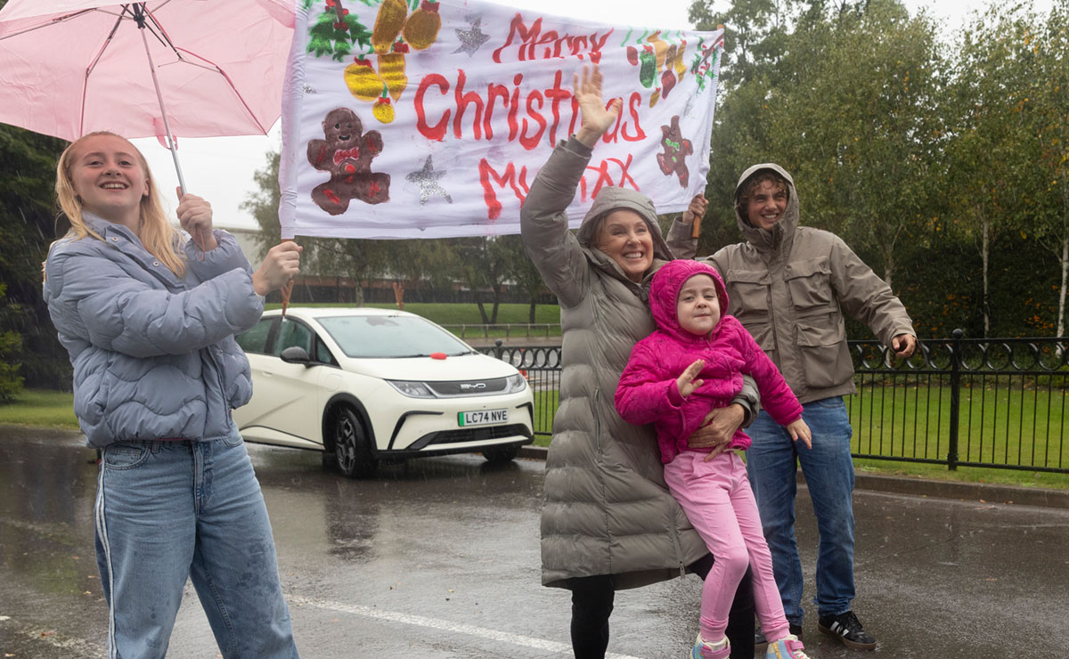 Once there, they hold up a large banner that reads “Merry Christmas Mum”, in the hope that Lou will be able to see it from her cell window.