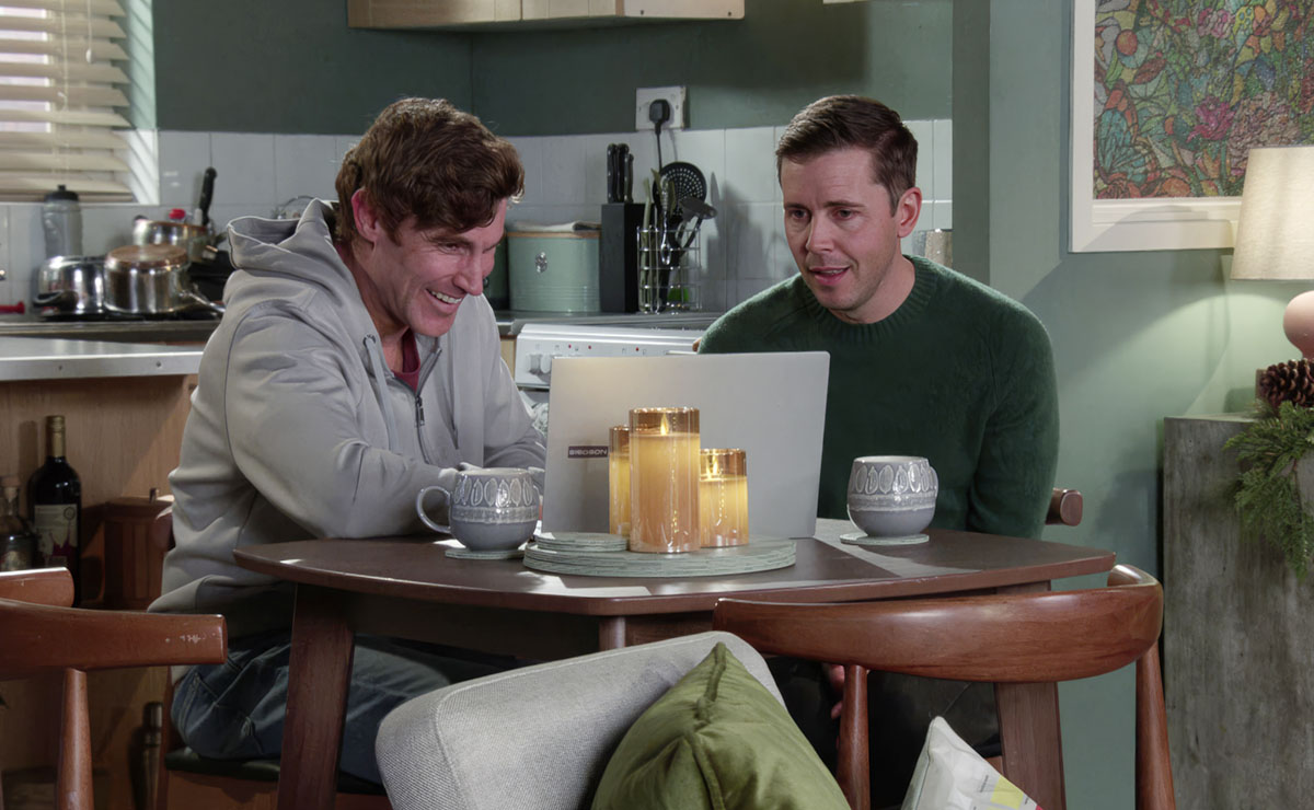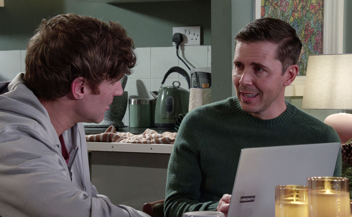 At the corner shop flat, Todd (Gareth Pierce) continues to put on a brave face as he faces Christmas with abusive partner Theo (James Cartwright).