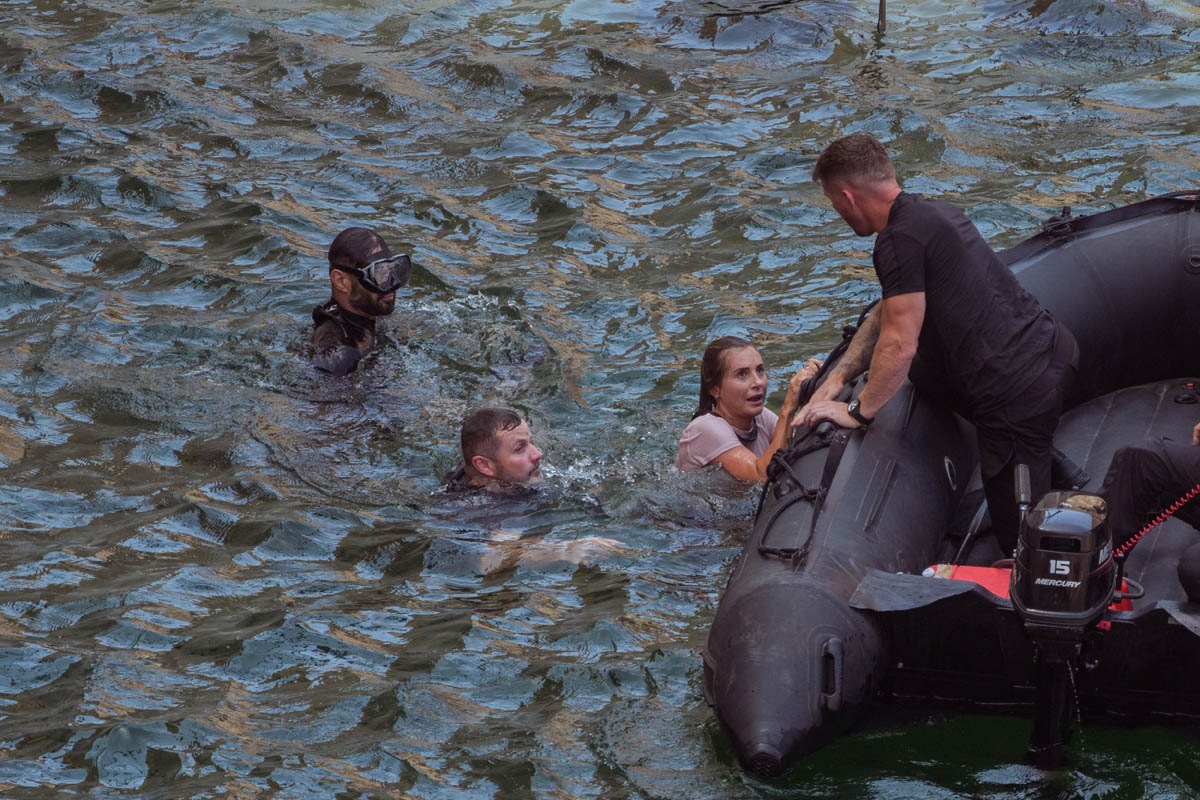 The first task saw the contestants take part in an emergency evacuation drill. In pairs, they were seated in a section of a plane fuselage, which was lowered into the water.