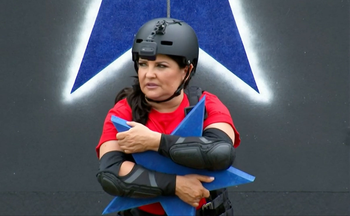 Rebekah’s first challenge saw her and three of her fellow celebs – comedian Nath Valvo, singer Deni Hines, and NRL star Luke Bateman – strapped to a crane and hoisted high into the air at speed, whilst having to keep hold of their stars.